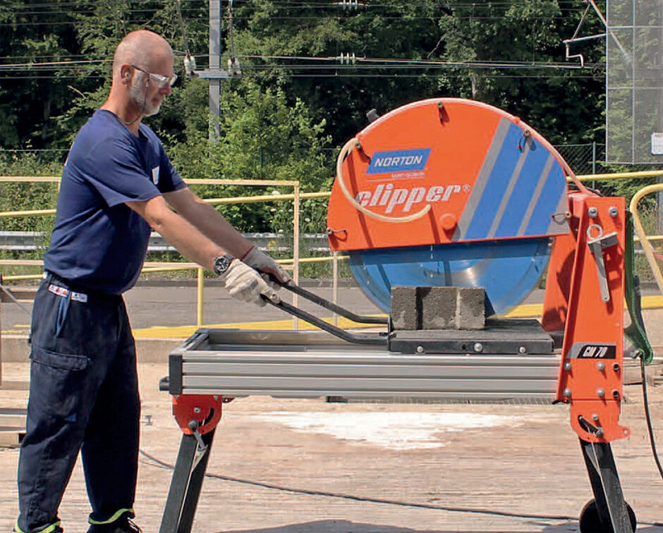 So präsentiert Norton Clipper Maschinen aus allen Produktbereichen. Das sind Fliesenschneidemaschinen, Brückenkopftischsägen, Tischsägen, Fugenschneider, Betonglätter, Trennschleifer, Bohrmotoren, Wandschlitzfräsen, Schleifmaschinen sowie Absaugeinheiten. Etwa die neue Großblocksteinsäge »CM 1000 Jumbo«: Sie kann sowohl ein Ø900er- als auch ein Ø1.000er-Blatt aufnehmen.