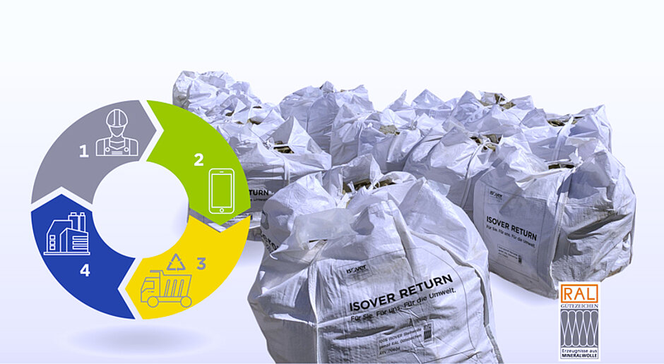 Vom Abfall zum Wertstoff – das Prinzip des neuen Rücknahmesystems ist ebenso einfach wie effizient. Der zu recycelnde Verschnitt aus ISOVER Sillatherm Steinwolle wird zunächst auf der Baustelle sortenrein und trocken in ISOVER Big Bags gesammelt. Zu bestellen sind die großen Transportsäcke beim jeweiligen WDVS-Partner, die Lieferung erfolgt durch ISOVER innerhalb von 72 Stunden. An den WDV-Systemhalter geht auch die Benachrichtigung, sobald die Big Bags befüllt und transportbereit sind. Innerhalb von fünf Arbeitstagen wird der Verschnitt von zertifizierten ISOVER Logistikpartnern auf der Baustelle abgeholt und fachgerecht ins Herstellwerk gebracht.