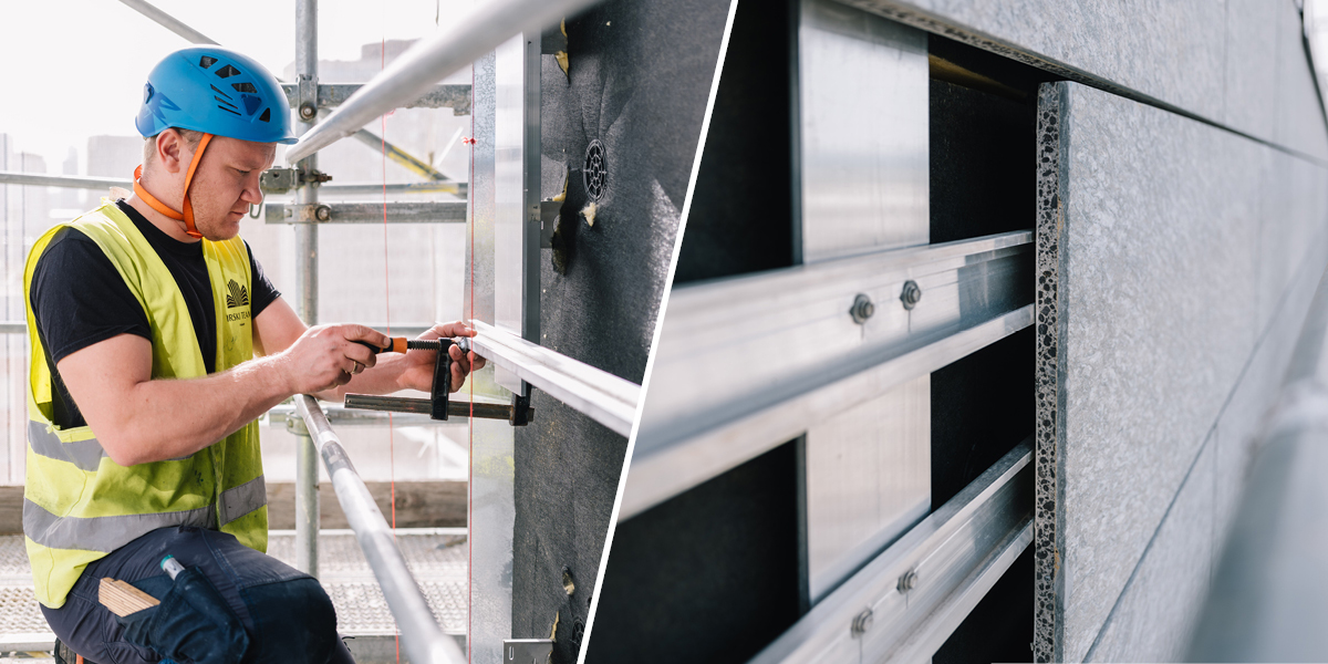 »Auf Wunsch des Bauherrn soll für das Gebäude ein möglichst hoher energetischer Standard erzielt werden«, erklärt Mathias Sonnenberg. »Mit der Fassaden-Dämmplatte ›Kontur FSP 1 Excellence‹ von Isover hat sich der Bauherr deshalb im Zuge der vorangegangenen Prüfungen und Planungen für die beste Dämmung entschieden, die sich finden lässt. Wir erreichen mit dem Aufbau der Außenwandkonstruktion einen U-Wert von 0,20 W/m²K. Die ›Kontur FSP 1 Excellence‹ ist aus Glaswolle, Euroklasse A1 nichtbrennbar und leistet einen hervorragenden Wärme-, Brand- und Schallschutz.« Mit einem Lambda-Nennwert von λD = 0,030 W/(m·K) beziehungsweise einem Lambda-Bemessungswert von λ = 0,031 W/(m·K) bietet die »Kontur FSP 1 Excellence« die nach Aussage von Isover bestmögliche Wärmeleitfähigkeit für Mineralwolle und damit eine herausragende Dämmleistung sowie höchste Energieeffizienz. Die mit einem schwarzen Vlies kaschierte Platte ist robust und zugleich elastisch, mögliche Unebenheiten des Untergrundes gleicht sie zuverlässig aus. Eine weitere Stärke liegt in ihrer Wetterfestigkeit. Die »Kontur FSP 1 Excellence« ist durchgehend wasserabweisend und ideal für schlanke Konstruktionen wie die vorgehängte hinterlüftete Fassade.