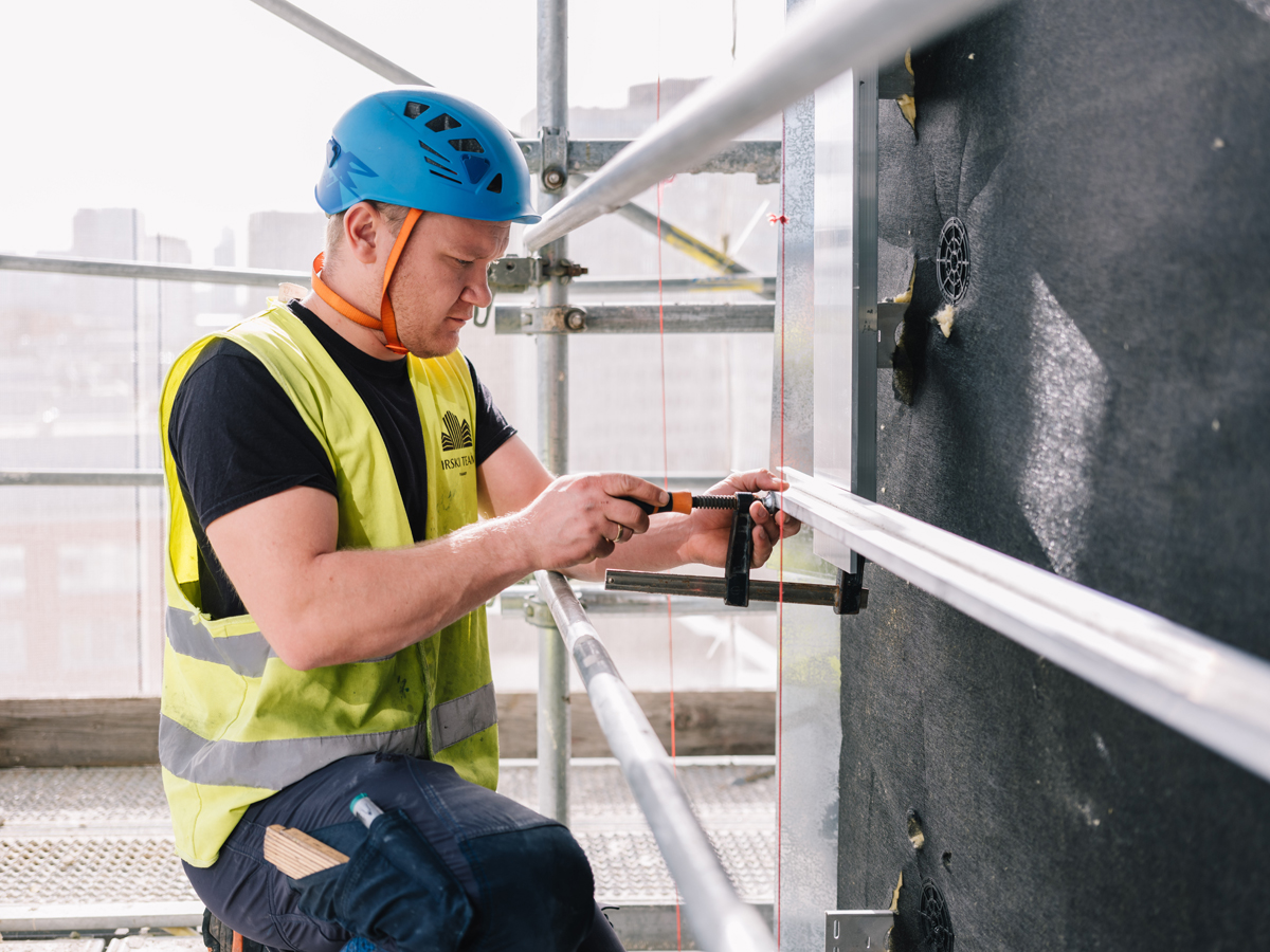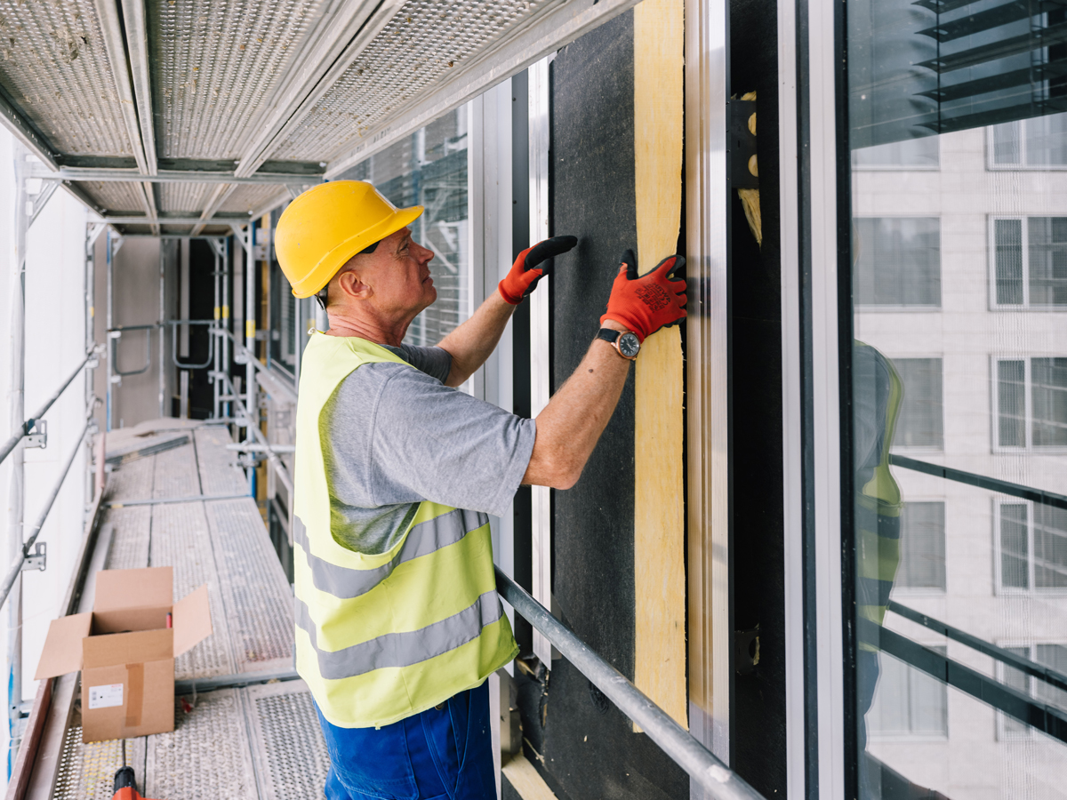 Um einen hochwertigen Wärmeschutz zu erzielen, wird die bisherige Dämmung des Gebäudes verdoppelt. Zum Einsatz kommen 2 x 80 mm »Kontur FSP 1 Excellence«-Fassadendämmplatten von Isover. Die schlanke Dämmplatte aus Glaswolle steht für höchste Dämmleistung und Energieeffizienz, sie ist nichtbrennbar und bietet darüber hinaus besten Schallschutz.