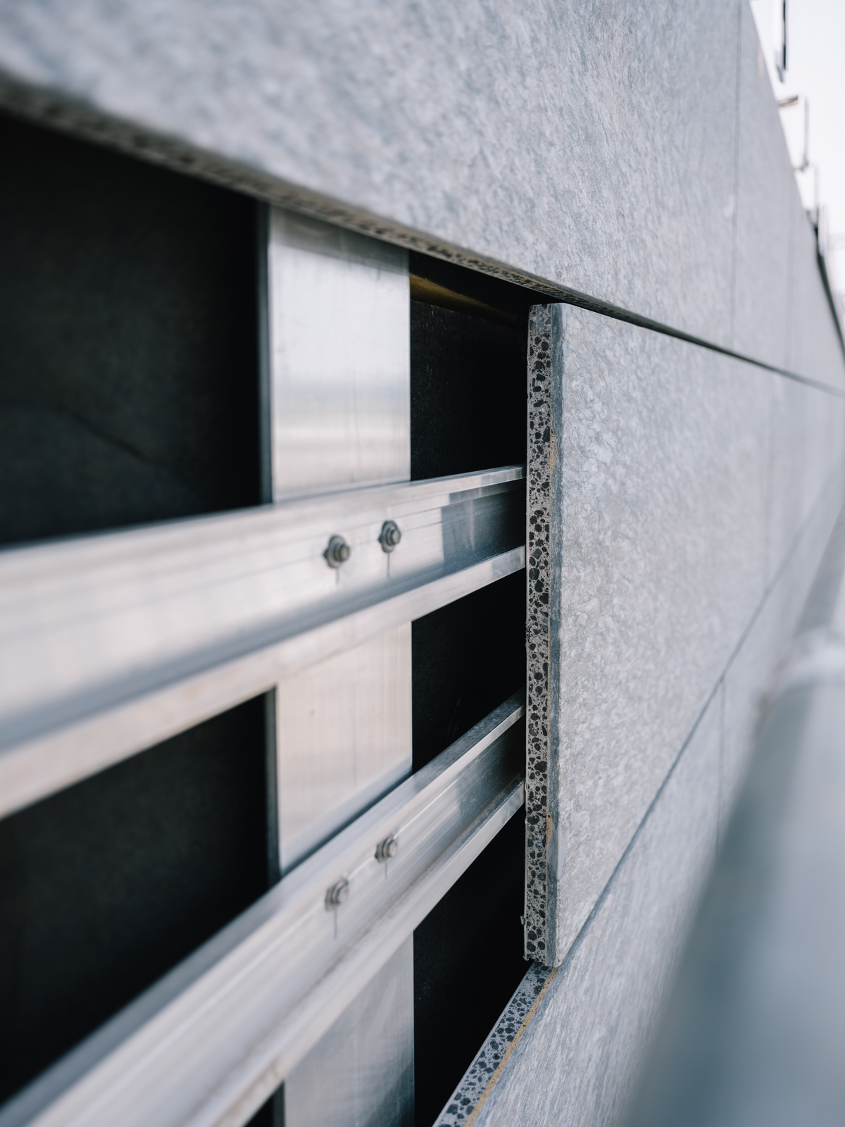 Die vorsortierten Fassadenplatten aus Gneis wurden anschließend im Werk der Firma Lithodecor Fassaden, einem Unternehmen von Naturstein Steinmann im sächsischen Vogtlandkreis, fachgerecht potenziert. »Die Natursteine werden mittig durchgeschnitten, sodass aus einer Natursteinplatte zwei dünnere werden. Jede Natursteinplatte wird dann gemäß der Litho-Stone zugehörigen allgemeinen bauaufsichtlichen Zulassung mit einer Leichtbetonträgerplatte vakuumverklebt, anschließend werden die Oberflächen geschliffen.« Das so upgecycelte Fassadenelement ist insgesamt 28 mm stark, davon macht die Natursteinplatte gerade einmal 10 bis 12 mm aus. »Stärker muss die Natursteinschicht auch nicht sein, da die an der Natursteinfassade auftretenden Kräfte durch das Verbundsystem geschlossen aufgenommen werden.«