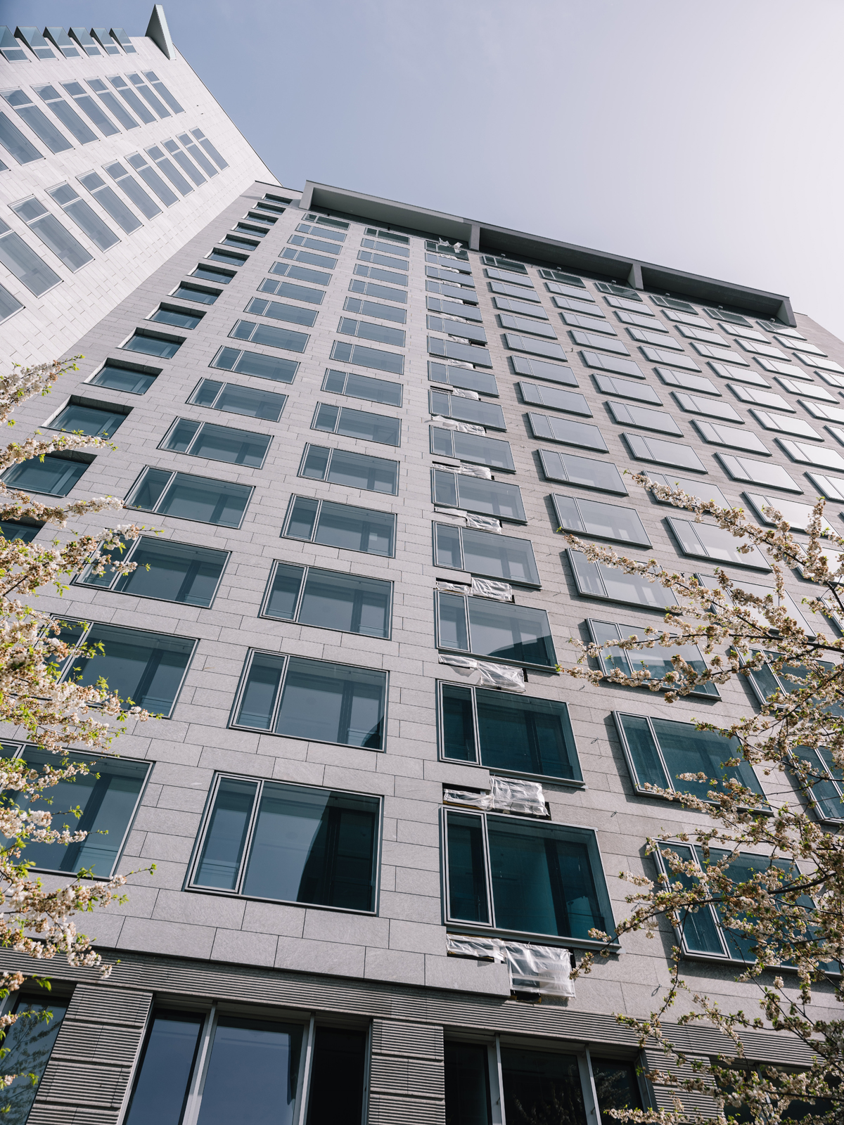18 Geschosse zählt das Bürohochhaus, das im Rahmen der energetischen Modernisierung auch gleich einen neuen Namen bekam: Der außergewöhnliche Name »AYR« mit dem Y in der Mitte spielt auf den Y-förmigen Grundriss des Gebäudes an. Über mehr als 21 200 m2 Gesamtmietfläche verfügt der Büroturm, damit ist er eine zentrale und unverzichtbare Anlaufstelle für eine Vielzahl von Mietern. »Dank der Lärmschutzkonzepte wird die Lärmbelastung so weit gesenkt, dass die Bauarbeiten bei laufendem Betrieb ausgeführt werden können«, erklärt Mathias Sonnenberg, Projektleiter der ausführenden Firma Naturstein Steinmann im bayerischen Eltmann. »Die Büros sind während der Fassadenarbeiten durchgängig besetzt. Für Bohrarbeiten wird die Lärmbeeinträchtigung durch festgelegte Zeitfenster geregelt.«