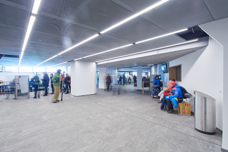 Mechanische Nehmerqualitäten unter Extrembedingungen waren in den neuen Ankunftsbereichen der großen Seilbahnkabinen gefragt. »Diese Flächen liegen in einem trockenen Frostbereich, das heißt, sie befinden sich zwar im Gebäudeinneren, aber sobald sich die automatischen Türen der Station und der Kabinen öffnen, strömt eisige Luft ins Innere. Gleichzeitig muss natürlich damit gerechnet werden, dass die Besucher noch Schneereste an ihren Schuhen haben und sich so Feuchtigkeit auf dem Boden sammelt«, so Gartman. Eine Situation, auf die das Ausbauteam mit einer besonderen Konstruktion reagierte.