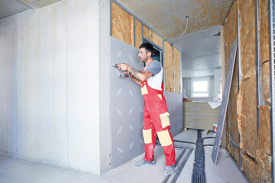 »Mit dieser Konstruktion erfüllen wir nicht nur das geforderte Schalldämmmaß von 58 dB, die Wände sind auch äußerst robust und stehen Massivwänden etwa beim Thema Lastenbefestigung in nichts nach«, erklärt Arber Elshani, verantwortlicher Projektleiter der Gottfried Mack Stuckateurfachbetrieb GmbH. »An mit ›Rigips Habito‹ beplankten Wänden können mit einer normalen Schraube ohne Dübel oder zusätzliche Traversen Lasten von bis zu 30 Kilogramm befestigt werden. Das heißt, die ganze Wand ist quasi eine ›Traverse‹. Die zukünftigen Mieter haben damit alle Freiheiten bei der Inneneinrichtung.«