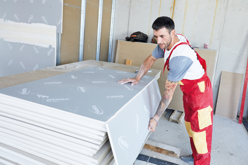 Positiv für das Trockenbauteam um Arber Elshani: »Rigips Habito« lässt sich wie eine herkömmliche Hartgipsplatte bearbeiten. Die Platten werden einseitig mit einem normalen Cuttermesser angeritzt und können dann sauber und exakt an der Schnittkante gebrochen werden. Ein zusätzliches Glätten der Kanten mit einem entsprechenden Hobel ist meist nicht nötig. Positiv für Planer und Bauherrn: Trotz ihres massiven Charakters fallen Wände mit »Rigips Habito« im Vergleich zu Wänden etwa aus Porenbeton oder Kalksandstein für die Gebäudestatik kaum »ins Gewicht«, so Hersteller Rigips. Darüber hinaus werde nahezu keine zusätzliche Baufeuchte bei der Errichtung der nichttragenden Innenwände eingebracht, was einem raschen Baufortschritt zuträglich sei.