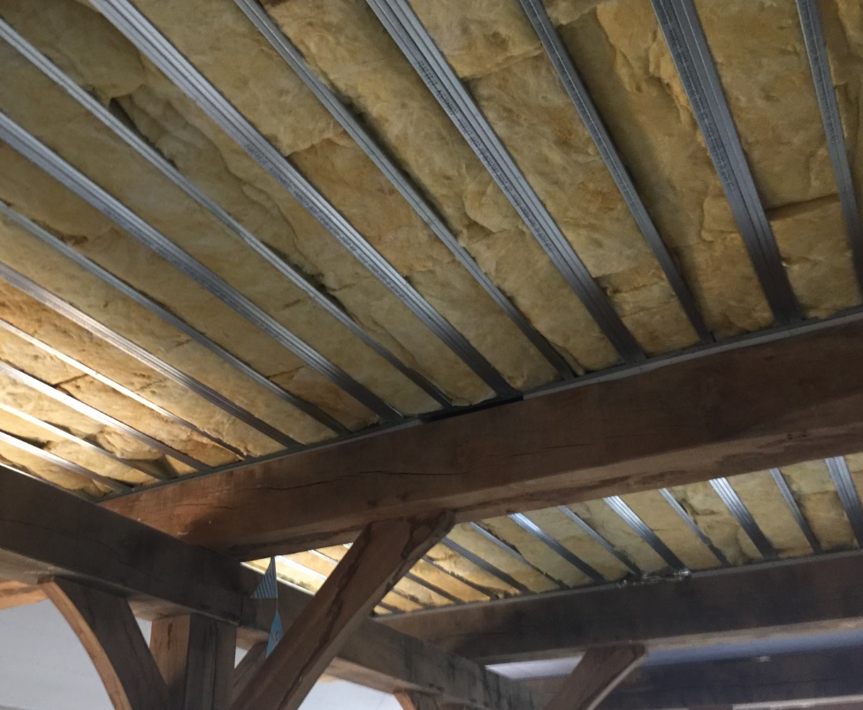 Um die Rohdecke nicht mit weiteren Gewichten zu belasten, wurde die nachfolgende Schallschutzdecke als freitragende Konstruktion gemäß dem Rigips System FD22RB mit einer Spannweite bis 3.700 mm ausgeführt. Zusätzlich wurden noch Einzelprofile eingestellt, um die Tragfähigkeit zu erhöhen. „Zwischen den Profilen haben wir eine