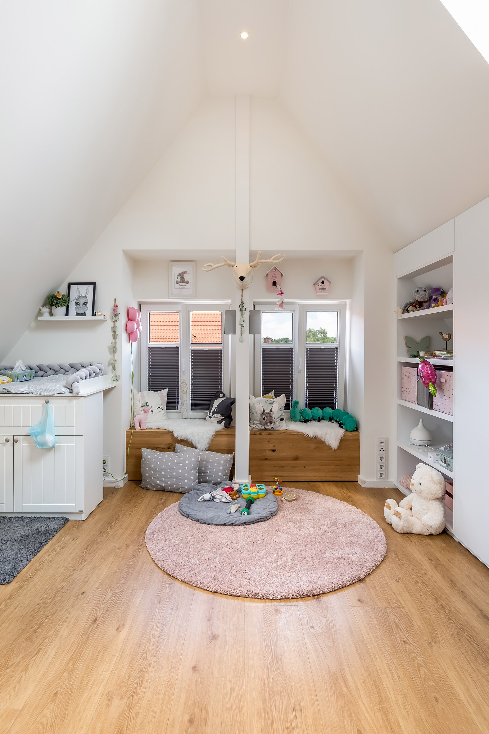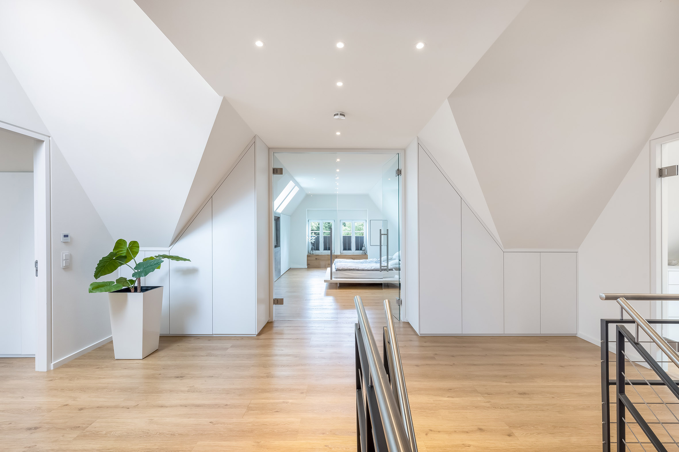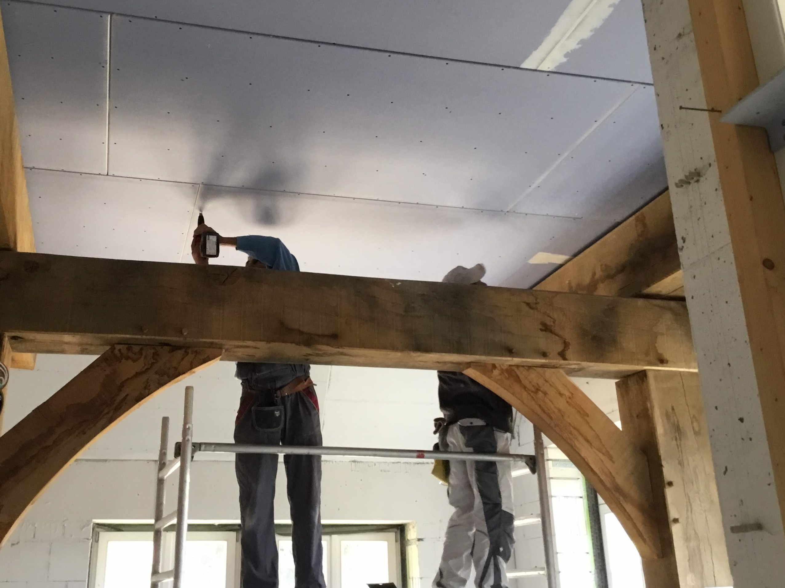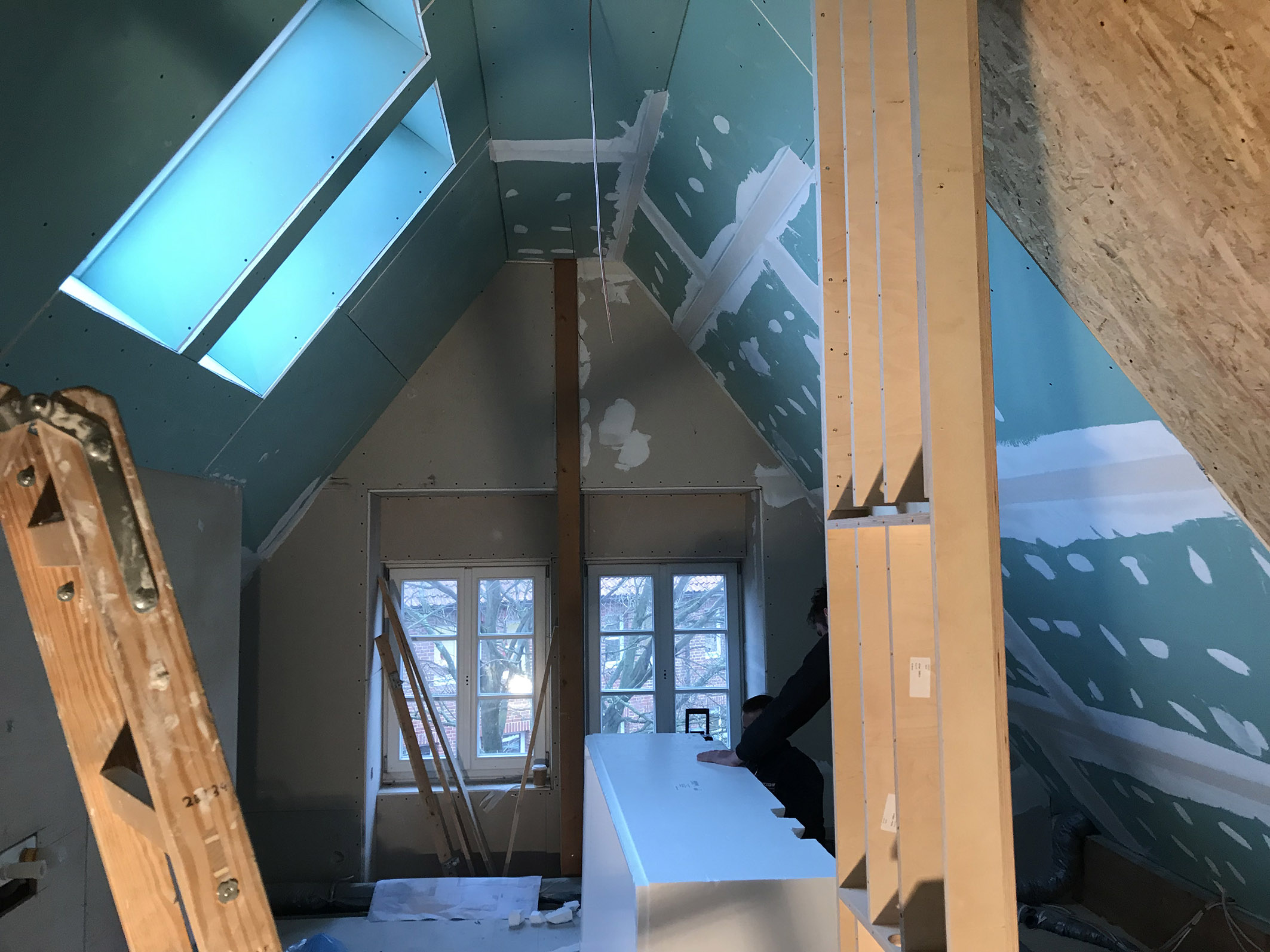 „In den Bereichen des Treppenaufgangs zum Spitzboden konnte die Deckenbeplankung problemlos an die Holzbalken angeschlossen werden, da diese – wie im Erdgeschoss – mit einer Abbrenndauer von 90 Minuten klassifiziert wurden. Auch die Wohnungstrennwände konnten daher einfach an die Balken angeschlossen beziehungsweise von oben auf die Balken gestellt werden“, erklärt Martin Lübbert. Für die zweite Beplankungslage der Dachschrägen im Spitzboden wählte das Ausbauteam Rigips Die Weiße in der Ausführung als Feuerschutzplatte. „Dort gab es viele kleinere und recht verwinkelte Flächen, die wir mit dieser Platte wesentlich schneller und einfacher in Q3 ausführen konnten.“