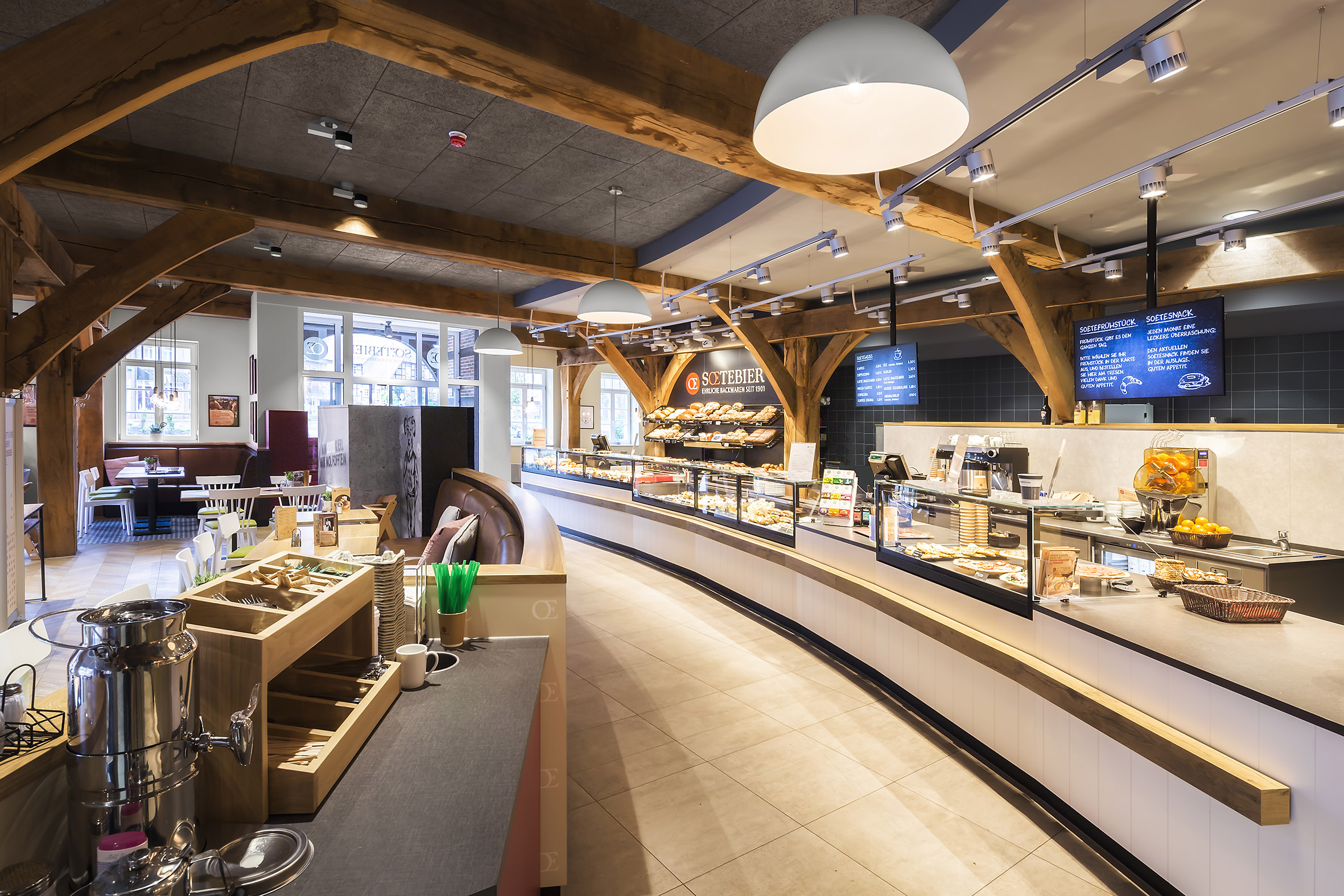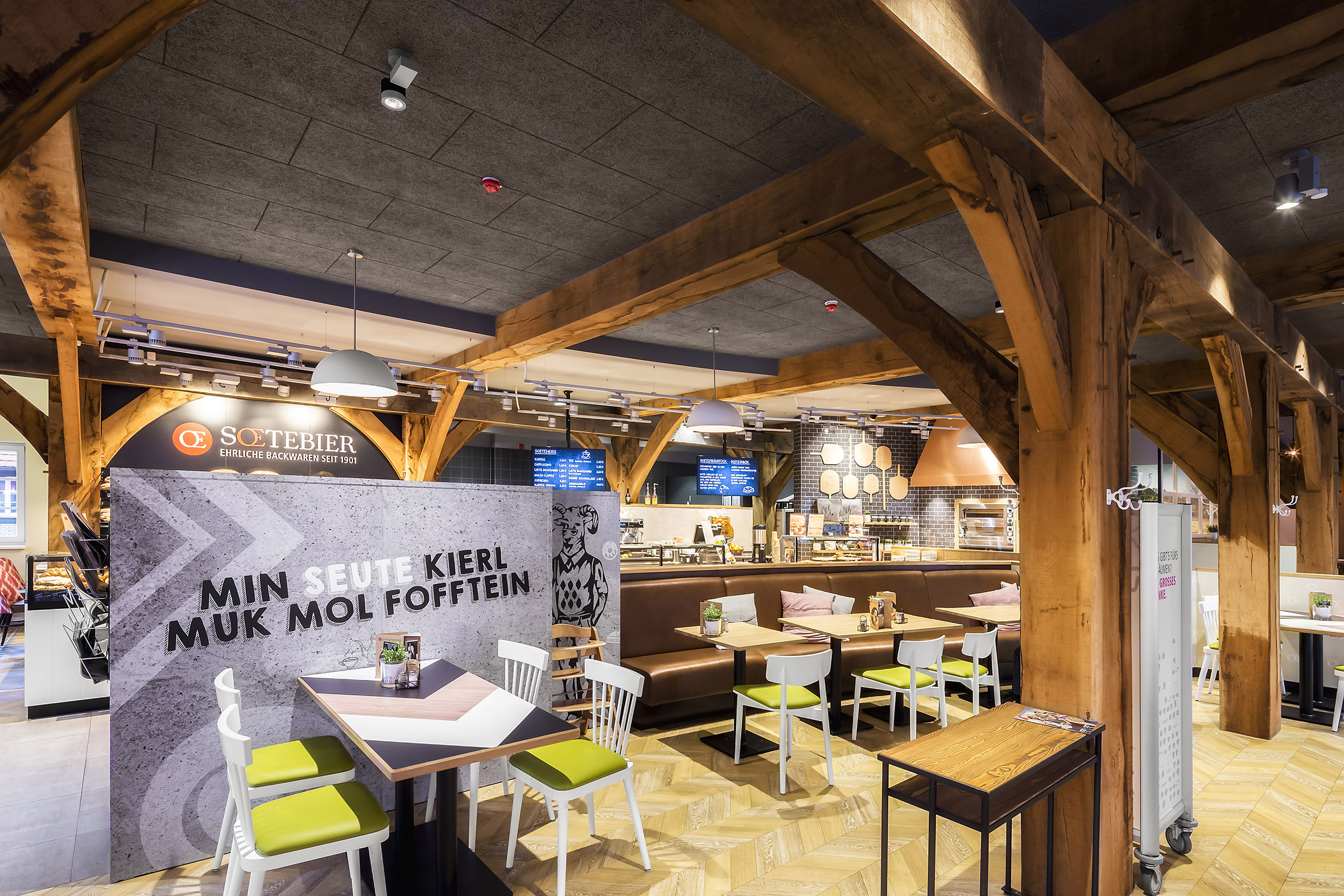 Da die Bäckereifiliale neben einem Verkaufsraum auch über einen größeren Café- und Aufenthaltsbereich verfügen sollte, realisierten die Trockenbauprofis eine Reihe weiterer Ausbauideen. So erhielten die späteren Sitzbereiche beispielsweise eine optische Trennung durch eine nichtraumhohe Trennwand. Zur Verstärkung dieser Wände wurde ein Rahmen aus UA-Profilen montiert und die gesamte Unterkonstruktion anschließend mit einer Lage Rigips Bauplatten RB und einer zweiten Lage mit Rigips Die Weiße beplankt. „Diese ,Q3-Platte‘ – wie sie von uns auch schlicht genannt wird – verfügt unter anderem über einen sehr hellen Oberflächenkarton sowie über abgeflachte Kanten an allen vier Seiten. Sie erleichtert damit die Erstellung besonders glatter Oberflächen. Deshalb kamen die Platten zum Beispiel auch bei der Erstellung des großen Deckensegels zum Einsatz, welches formfolgend über dem runden Verkaufstresen an der freitragenden Schallschutzdecke montiert wurde.“