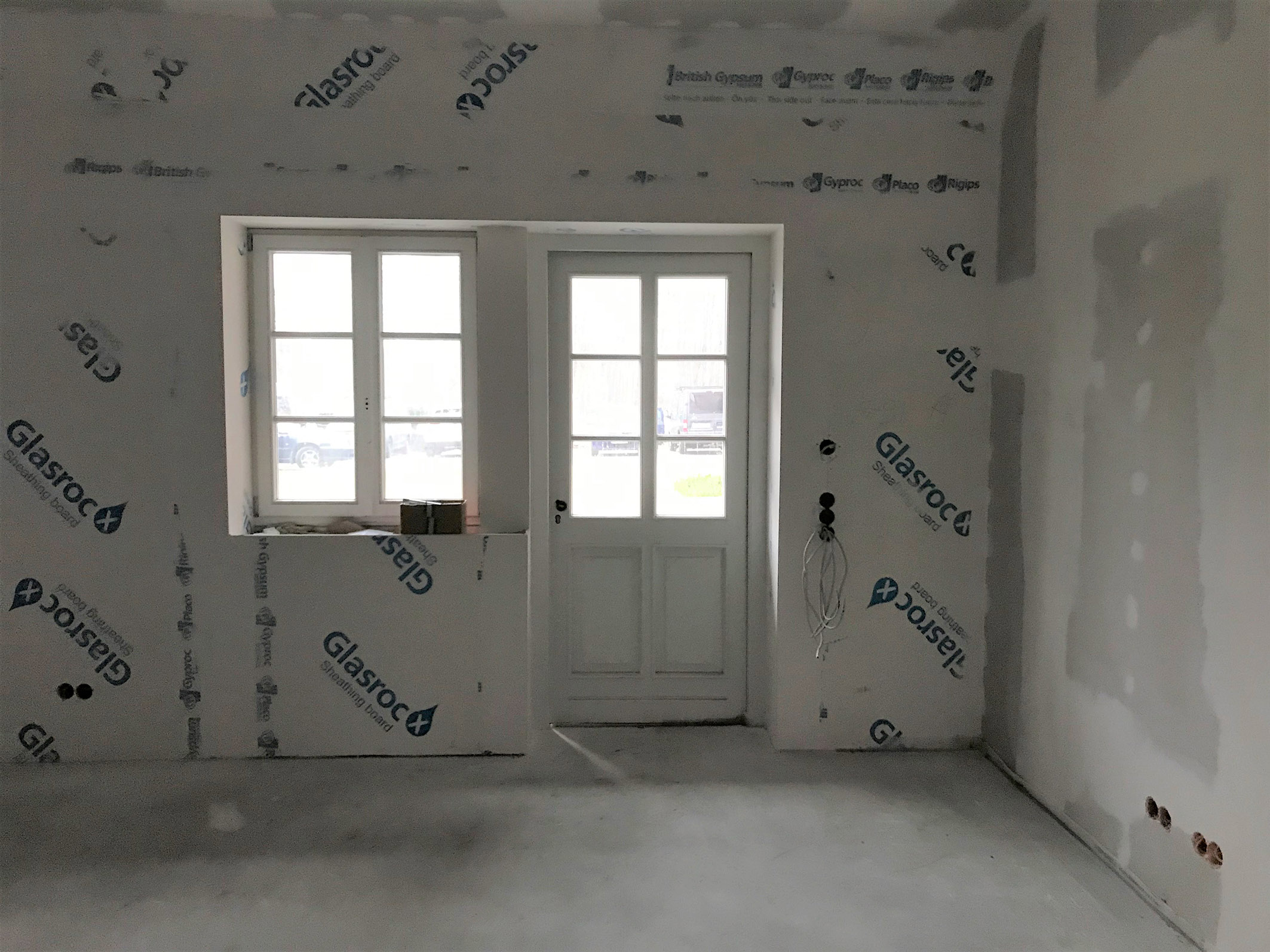 Wie jede Fachwerkfassade sind auch die aufwändig und mit viel Liebe zum Detail ausgeführten Außenwände des neuen Dorfkruges nicht zu einhundert Prozent schlagregendicht. Um für einen zusätzlichen Feuchteschutz zu sorgen, entschieden sich Martin Lübbert und sein Team dazu, die innenseitige Bekleidung der Außenwände auf der Schlagregenseite mit der speziellen, schimmelresistenten Feuchtraumplatte Rigips Glasroc X auszuführen. Dafür wurden die Platten mit Rifix Ansetzbinder auf Zementbasis gemäß Rigips System WB01GX im Punkt-Wulst-Verfahren verklebt. An allen Außenwänden, die sich nicht auf der Schlagregenseite befinden, wurde eine direktbefestigte Vorsatzschale mit Holzunterkonstruktion, Klimamembran und einer Beplankung aus Rigips Bauplatten RB montiert.