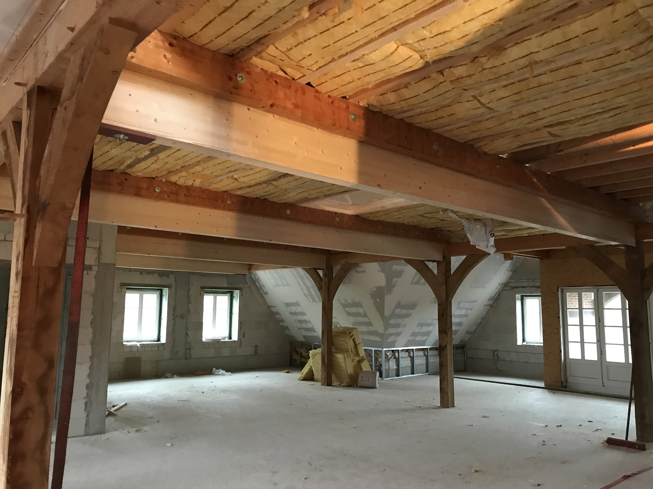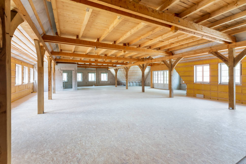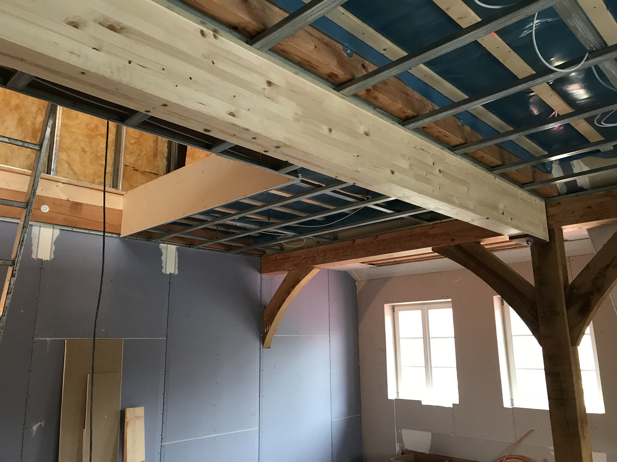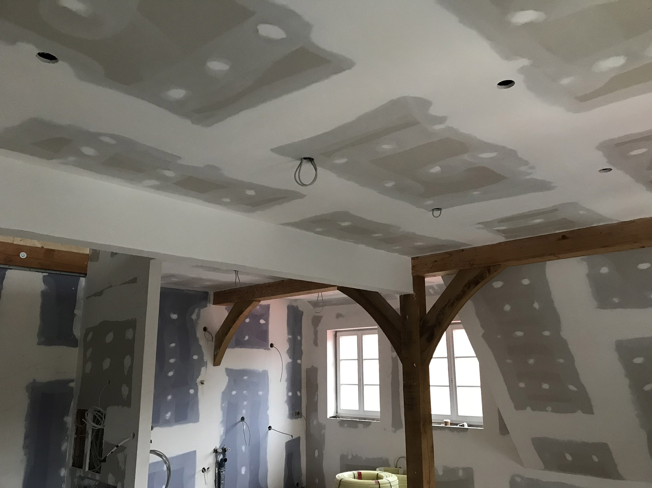 Alle Wohnungen wurden nach modernsten Maßstäben ausgebaut. Exemplarisch erläutert Martin Lübbert die Arbeiten anhand von Wohnung 14, die sich auf 280 m2 über das Obergeschoss und den Spitzboden erstreckt. „Auch dort stand zunächst der Brandschutz im Fokus. Alle statisch relevanten Stahlbauteile, die die Holzbalkendecke über dem Obergeschoss stützen, haben wir mit Glasroc F in F90 eingehaust. An die eigentliche Holzbalkendecke, die Dachschrägen, die Decke im Spitzboden sowie an die Holzfußböden bestand eine F60-Brandschutzanforderung.“ Aufgrund einer vorhandenen oberseitigen Holzverschalung der Zwischenbalkendecke sowie einer verschalten Dachschrägenfläche (Harzer Dach) konnten die F60-Decke und F60-Dachschrägenbeplankung mit 2 x 12,5 mm Rigips Feuerschutzplatten RF ausgeführt werden. Die Zwischenbalkendecke wurde vor Montage der Brandschutzbeplankung in kompletter Balkenstärke mit nichtbrennbarer Mineralwolle (ISOVER ULTIMATE) gefüllt. Die Verspachtelung erfolgte mit der Fertigspachtelmasse Rigips ProMix Plus in Q3.