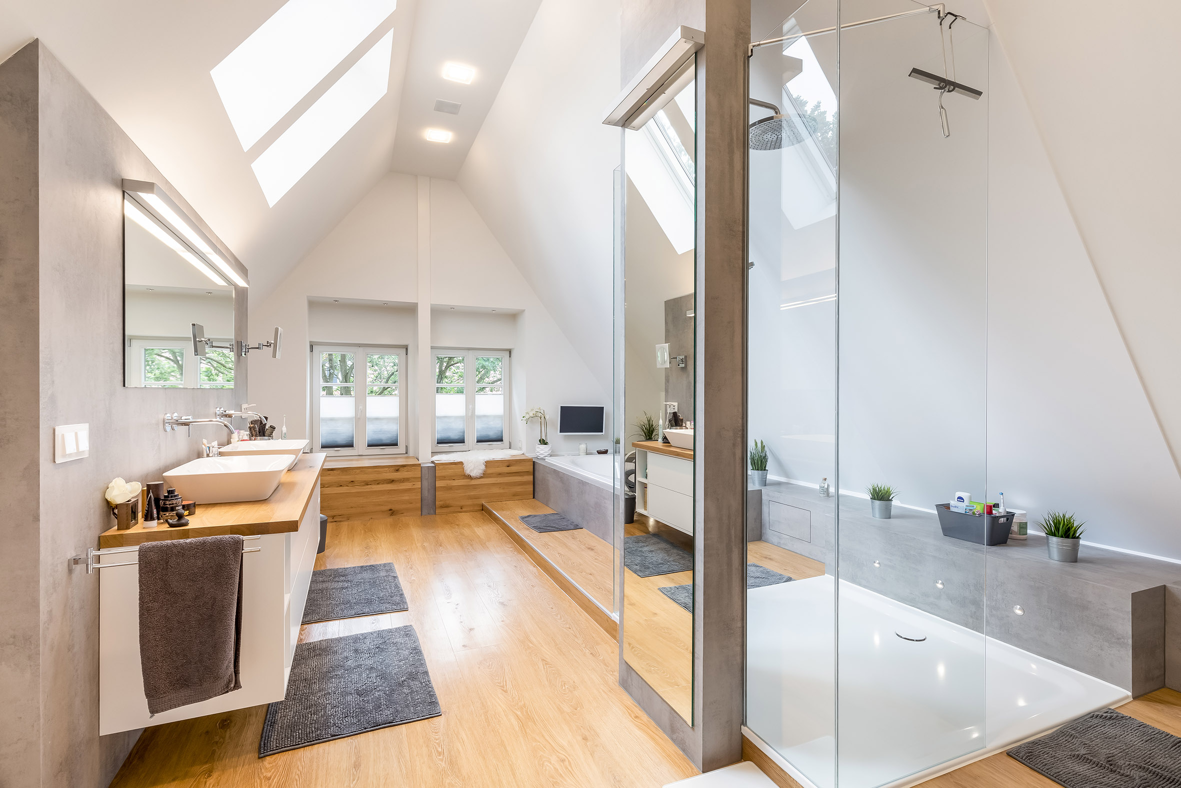 Eine Mischkonstruktion findet sich im Badezimmer: Um eine Ganzglasdusche sicher befestigen zu können, wurde an der Dachschräge eine zusätzliche Holzwerkstoffplatte montiert. Ebenfalls im Duschbereich errichtete das Team eine Holztragkonstruktion, die später einen großen, fast raumhohen Spiegel tragen sollte, der gleichzeitig als Heizung dient. Die Beplankung aller weiteren Dachschrägen in diesem Bereich wurde gemäß Rigips System DA41RF mit einer Lage Rigips Feuerschutzplatten RF und in der zweiten Lage mit Rigips Feuerschutzplatten imprägniert RFI ausgeführt.