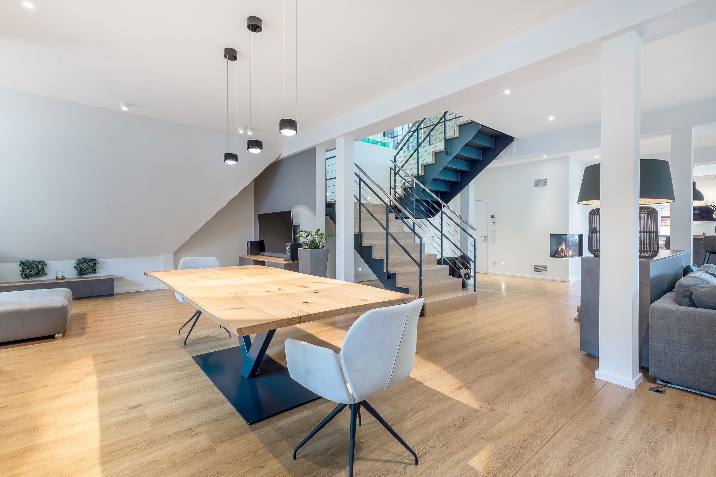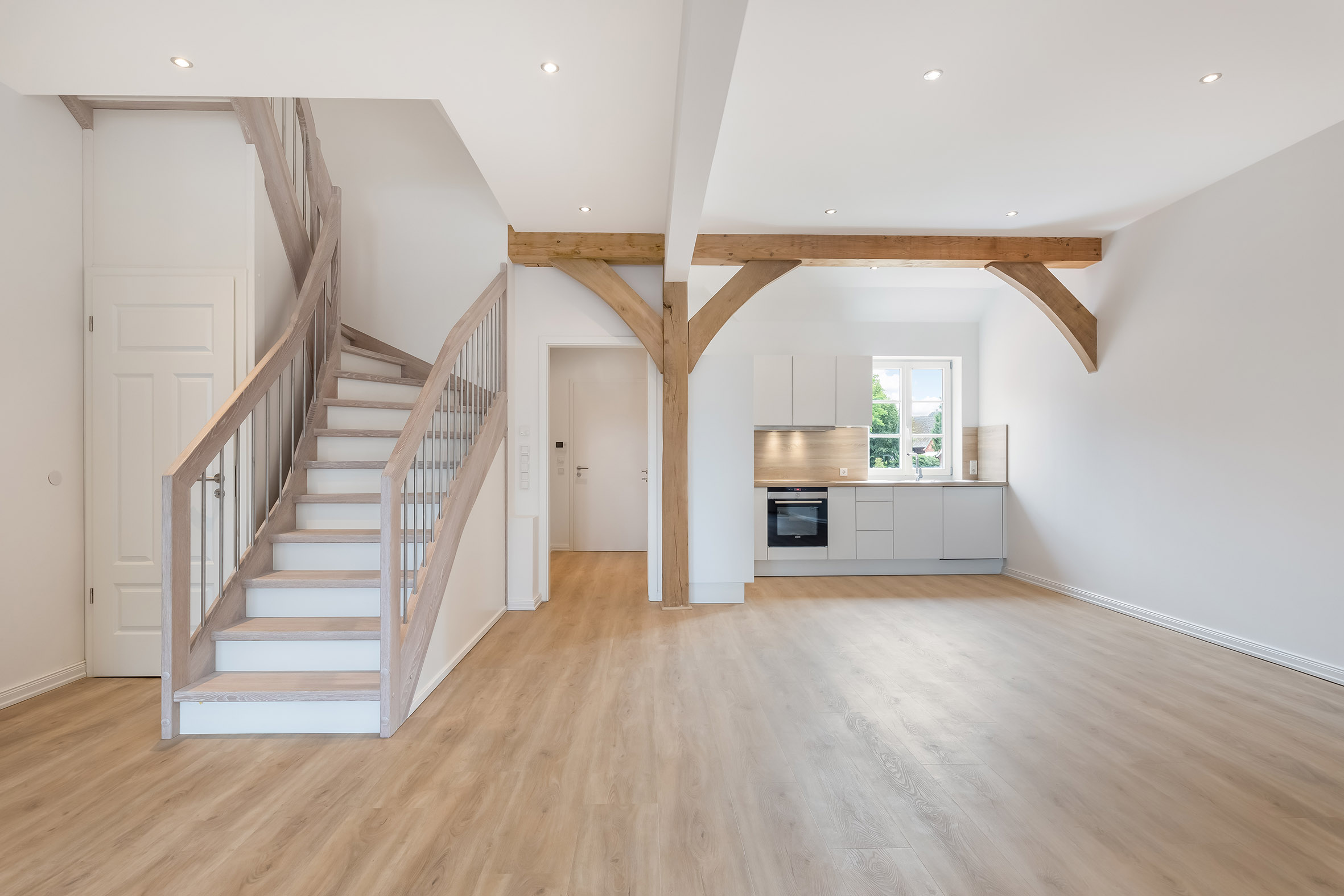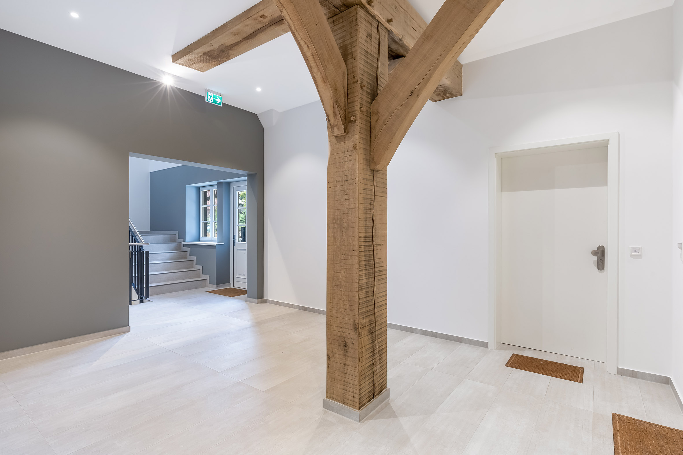 Bei allen brand- und schallschutztechnischen Herausforderungen verlor das Team um Martin Lübbert nie das Ziel aus den Augen, Wohnräume zu schaffen, die auch unter optischen Gesichtspunkten zu überzeugen wissen. Viele attraktive Ausbauideen wie abgerundete Wandbereiche, die gelungene Integration der massiven Holztragwerke oder die elegant gestalteten Treppenhäuser, über die alle Wohnungen erschlossen werden, sorgen im Dorfkrug für ein angenehmes Wohnambiente.