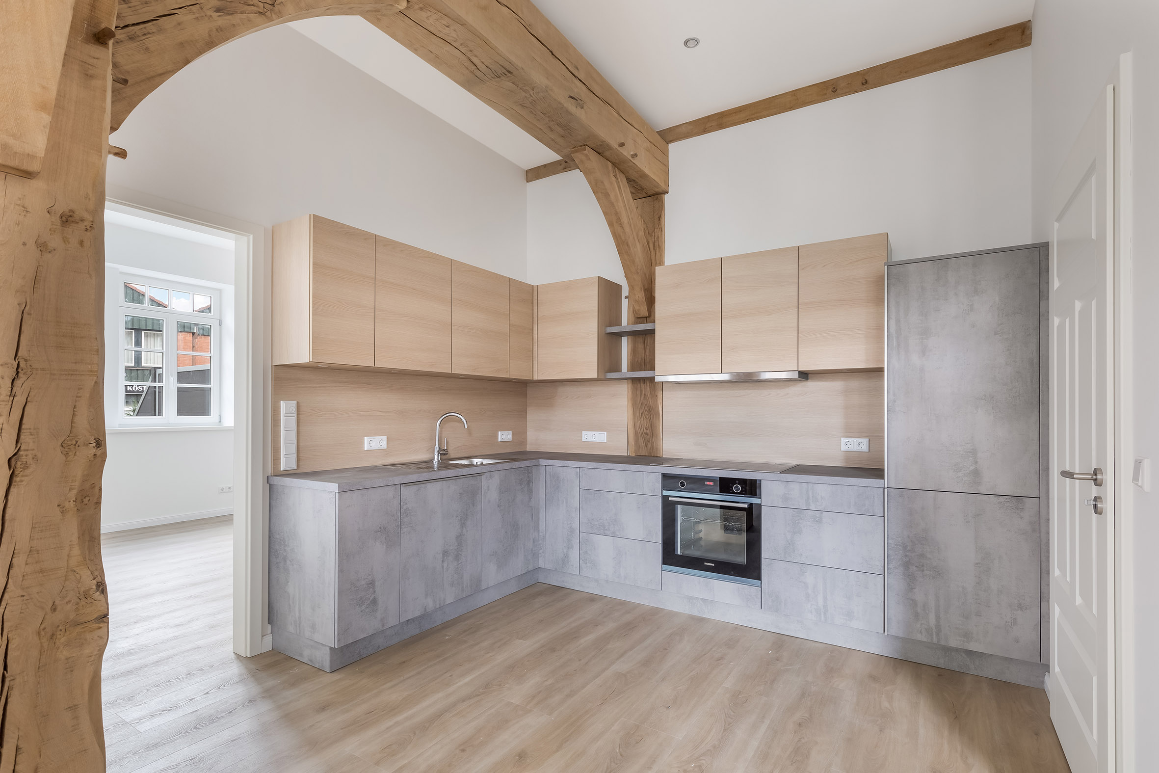 Neben der Bäckerei finden sich im Erdgeschoss neun zwischen 38 und 95 m2 große Wohnungen. Die Größe der Wohnungen im Obergeschoss variiert zwischen 51 und 280 m2. Die größte Wohnung, Wohnung Nr. 14, nutzt den weiträumigen Spitzboden des Gebäudes und wurde als großzügige Maisonette-Wohnungen konzipiert. Eine der wichtigsten Fragestellungen ergab sich gleich im Erdgeschoss. Es galt zu überlegen, ob die vorhandene Balkenlage in Kombination mit der vorhandenen Betondecke alle geplanten statischen Lasten abfangen kann oder ob eine komplett neue Stahlbetondecke eingezogen werden sollte. Letzteres hätte zu einer Baukostensteigerung im siebenstelligen Bereich geführt. Deshalb entschied man sich für eine Brandschutzdecke und eine freitragende Schallschutzdecke mit zusätzlicher Sichtdecke in Trockenbauweise.