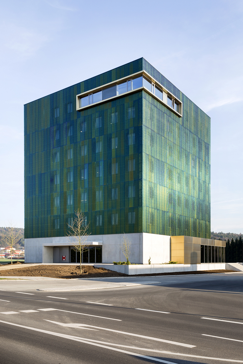Die Grundfläche des beeindruckenden, sechsgeschossigen Gebäudes beträgt rund 22,50 x 22,50 m. Die tragenden Wände sowie die Decken im Baukörper wurden aus Stahlbeton gefertigt. Trenn- und Schachtwände sowie abgehängte Akustikdecken und Deckensegel konstruierte das Team um Aslani Muhidin mit unterschiedlichen Trockenbaukonstruktionen.