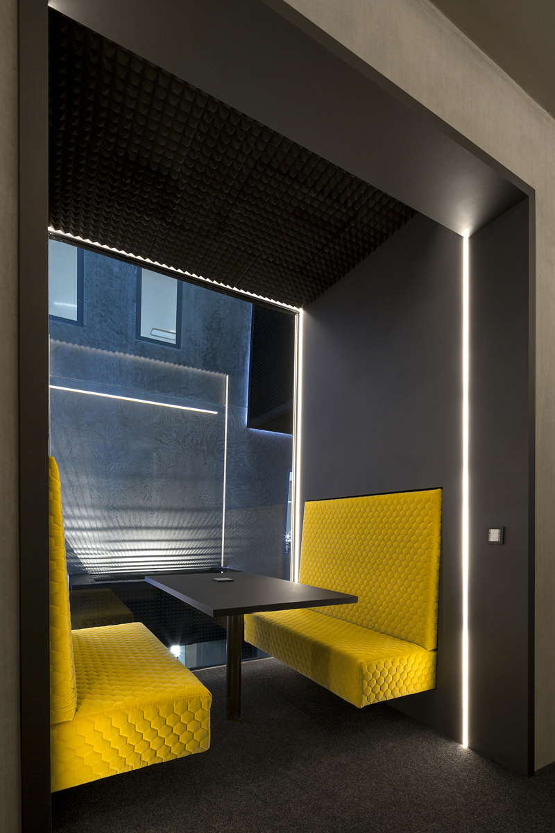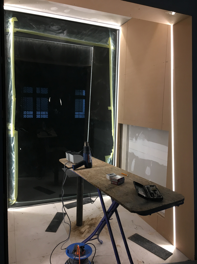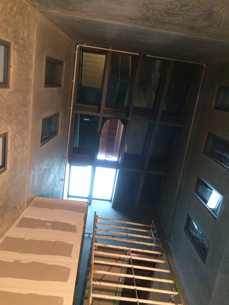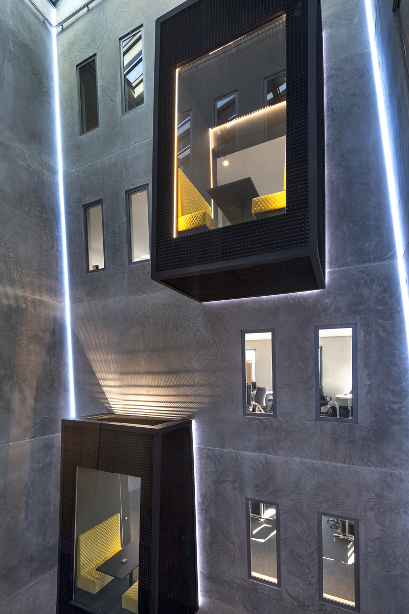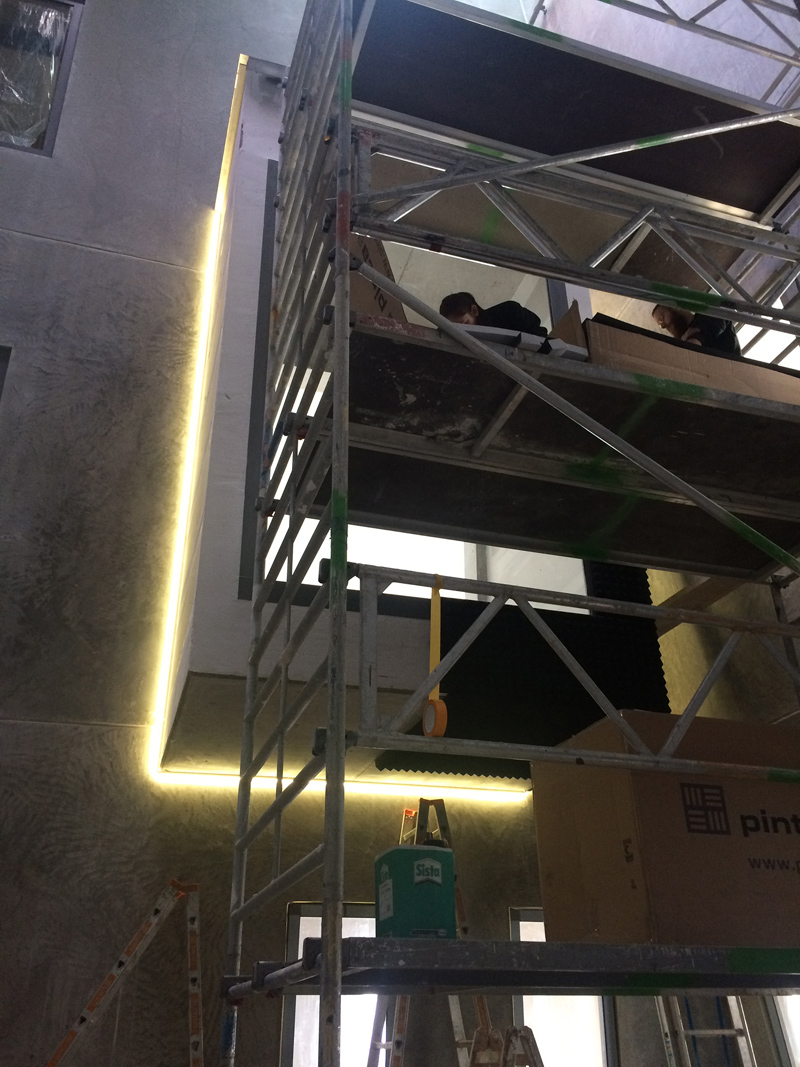 „Alle Boxen werden innen und außen indirekt be- und angeleuchtet, sodass bei der Oberflächenbehandlung höchste Sorgfalt gefragt war, um etwaige Unebenheiten im Spachtelauftrag zu vermeiden. Die eigentliche Herausforderung bei der Umsetzung dieser außergewöhnlichen Raumzellen lag aber vor allem im Ort ihrer Errichtung. Die oberste Zelle findet sich auf einer Höhe von 22 Metern, was insbesondere die Montage der äußeren Beplankungslagen schwierig machte. Hierfür wurde im Atrium ein spezielles Hochgerüst errichtet“, erinnert sich Trockenbauprofi Aslani Muhidin.