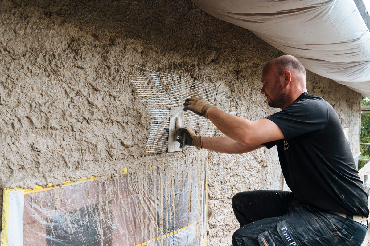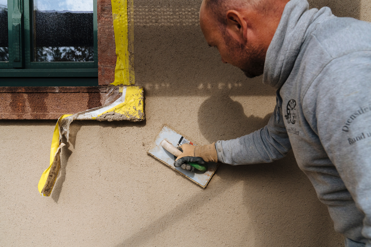 Für die Putzarbeiten kam zunächst der Spritzmörtel »VSM« von Sakret zum Einsatz, der Haftung und Saugverhalten des Untergrunds verbessert. Darauf folgte der Grundputz Trass-Kalk-Mörtel »TKM 0-4«, anschließend wurde mit »TKM 0-2« verputzt. Dieser Trass-Kalk zeichnet sich durch seine guten Hafteigenschaften in vielen Bereichen aus. Aufgrund seiner Ähnlichkeit zu historischen Mörteln und seiner guten Verträglichkeit mit Natursteinen wird er auch viel im Denkmalschutz und der Altbausanierung verwendet.
