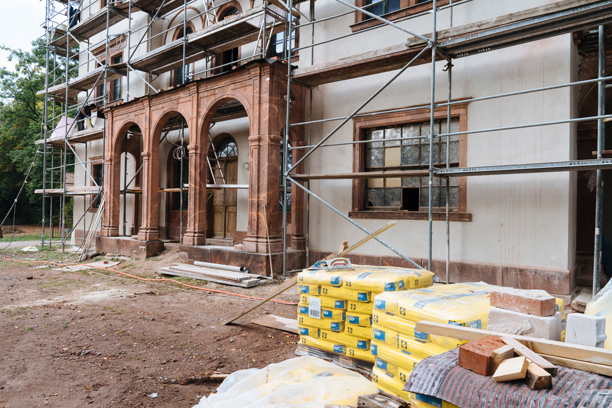 Die jetzt abgeschlossene Sanierung des Erdgeschosses begann mit einer umfassenden Stabilisierung der Bausubstanz. Alte Mauerwerksrisse wurden mit modernen Gewindespindeln und Hausankern behoben, Außenwände mit Stahlträgern und -seilen gestützt. Zudem wurde der gesamte erneuerte Dachstuhl mit Dämmplatten versehen und mit Schieferschindeln gedeckt – einschließlich der beiden silbernen Zierspitzen auf den Gauben. Eine Herausforderung war auch die Stabilisierung der charakteristischen Porphyr-Säulen am Entrée des Gebäudes: Dafür wurden Bohrlöcher mit einer Tiefe von 18 m mit Eisenstangen und Beton gefüllt, um die notwendige Tragfähigkeit zu garantieren.