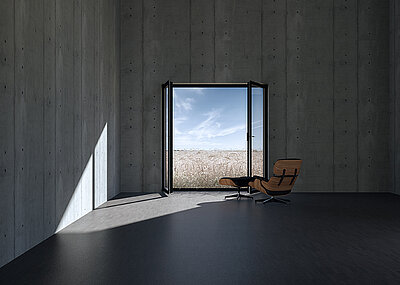 Ein Highlight: der Fensterflügel »greenEvolution_free« aus dem »greenEvolution«-Baukastensystem. Mit schmalen Ansichtshöhen von nur 100 mm ahmt er die elegante Optik historischer Holzfenster – wie das Galgenfenster um 1900 – detailgetreu nach.