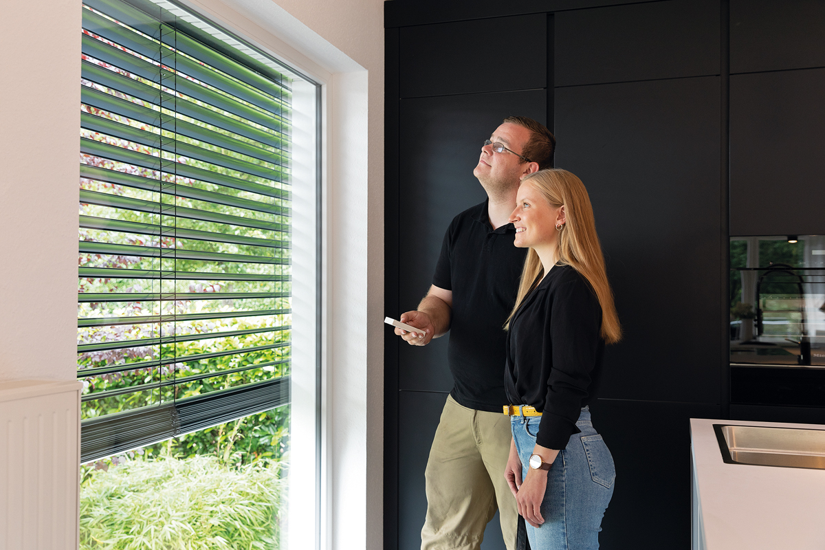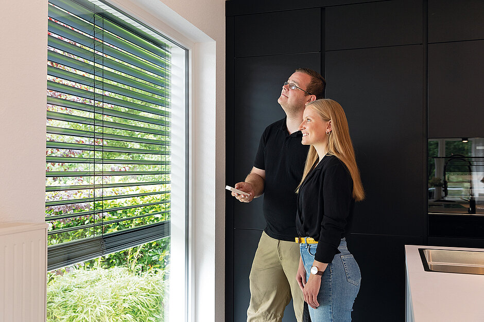 Eine Alternative bietet der Funk-Empfangsschalter in den Farbvarianten Weiß und Anthrazit, der gleichzeitig als Steuereinheit genutzt wird. Einmal installiert, lässt sich der Raffstore mit beiden Lösungen bequem per Schaltertastatur, Funk-Sender oder smart per App bzw. Sprachassistenten bedienen.