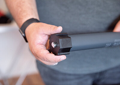 Die Einstellung der Endlagen erfolgt halbautomatisch. Damit Profis bei der Montage mehrerer Motoren Zeit sparen können, bietet Schellenberg Professional als Zubehör sein Schnell-Einstellwerkzeug mit 2,80 m Kabellänge an. Es wird per »STAK3« am vorhandenen »STAS3« des RaffstoreMotorkabels angeschlossen. Über die erstmalige Programmierung der Endpunkteinstellungen hinaus bietet es die Option, bereits angelernte Endpunkte nachträglich zu ändern oder zu löschen. J