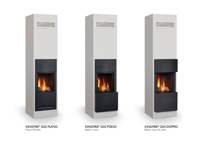Für das individuelle Erscheinungsbild des »Kingfire Gas« stehen mit den Modellen »Plano« (klassich minimal mit einem flachen Paneel), »Podio« (harmonisch mit einem Balkon unten) und »Doppio« (kubistisch mit Balkonen oben und unten) drei Front-Varianten zur Auswahl. Mittels der durchdachten Konstruktion ließen sich auch »Kingfire Gas« Modelle in jede Wohnsituation im Neubau integrieren und böten stets Kamingenuss auf kleinstem Raum.