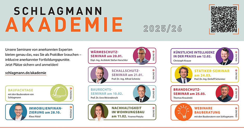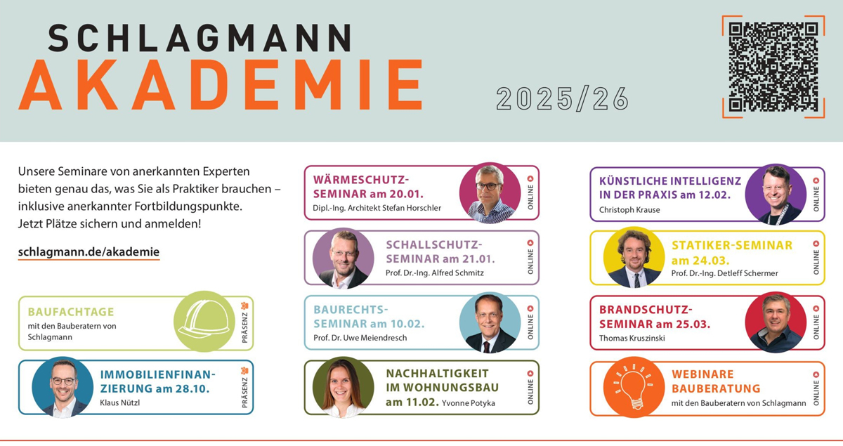 Den Auftakt bildet das Format „Immobilienfinanzierung im aktuellen Umfeld“ in Ingolstadt, bevor die Schlagmann-Bauberater im Rahmen der Baufachtage mit geballtem Fachwissen durch ganz Bayern touren. Live-Streams, die in dieser Saison erstmals auch das Thema Künstliche Intelligenz in der Baubranche behandeln, runden das Programm Anfang des Jahres 2026 ab. Wie gewohnt können die Teilnehmer wieder zahlreiche Fortbildungspunkte sammeln.
