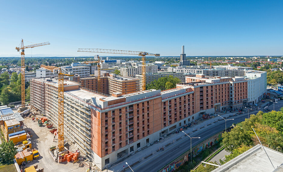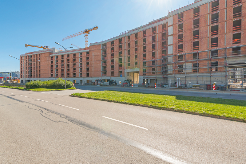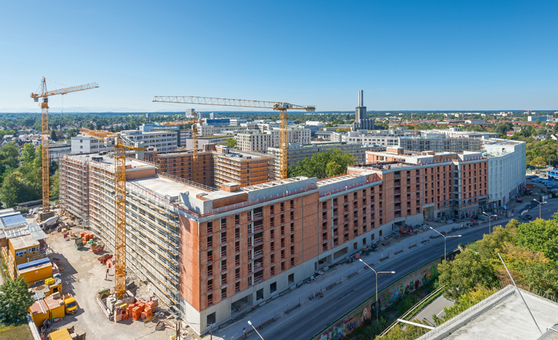 Die Wohnungen befinden sich in zehn Häusern, die um einen Innenhof herum gebaut wurden. Sprünge von sechs bis acht Geschosse akzentuieren die Vielfältigkeit der Gebäude ebenso wie unterschiedliche Fassadentypologien. Aus Gründen der Wirtschaftlichkeit fiel die Entscheidung der Architekten auf eine langlebige Baukonstruktion mit einem massiven Ziegelmauerwerk. »Wer mit der klaren Vorgabe bezahlbaren Wohnraum baut, muss natürlich gut rechnen. Sich dann für eine robuste, nachhaltige, auch über Jahrzehnte hinweg wartungsarme Außenwand aus massivem Blockziegelmauerwerk zu entscheiden ist nur konsequent,« so Architekt Prof. Carlo Baumschlager.