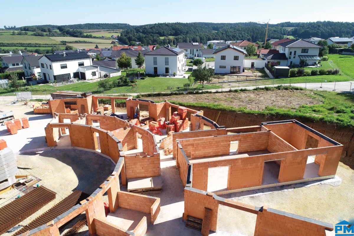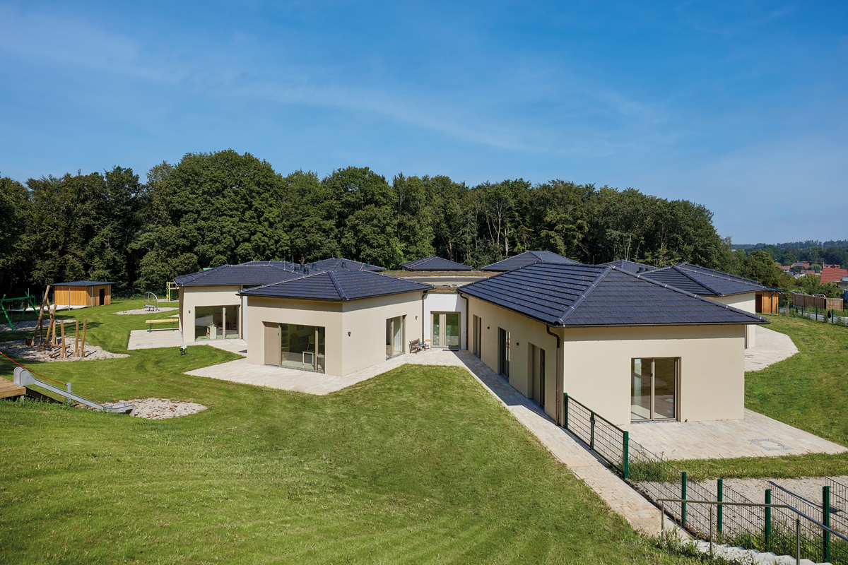 »Pavillon-Konzept« – so lautete der Wunsch der Marktgemeinde Ergoldsbach in der Planungsphase des Kinderhauses am Kapellenberg. Die Architekten Bindhammer entwarfen daraufhin bungalowähnliche Spielhäuser, die innen durch einen rund umlaufenden Spielflur miteinander verbunden sind. Diese münden in einen zentralen Innenhof, der an ein Atrium erinnert. So ergibt sich von oben betrachtet ein asymmetrisch-verspieltes Bild. Der Durchmesser des Bauwerks liegt bei 47 bis 60 m, je nachdem, wo man die Diagonale ansetzt. Umgesetzt wurde die Anlage mit dem »Poroton-T6,5« von Schlagmann Poroton, der dank seiner Füllung aus dem natürlichen Vulkangestein Perlit eine einschalige und hochwärmedämmende Hülle bildet. Im Rahmen des kommunalen Finanzausgleichs und zusätzlich durch das Sonderinvestitionsprogramm »Kinderbetreuungsfinanzierung 2017–2020« wird das Bauprojekt gefördert.