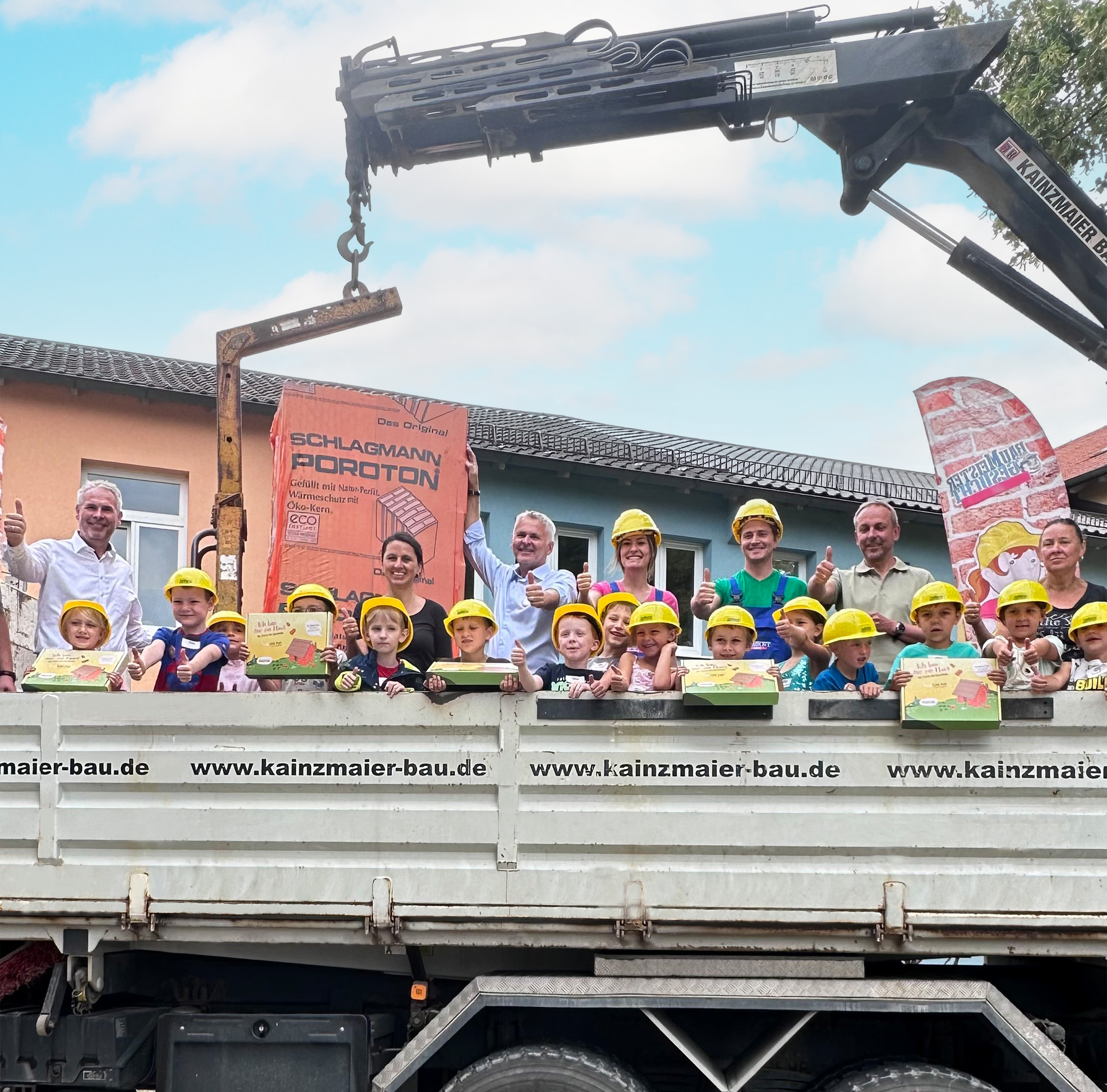 Das Projekt, initiiert vom Bayerischen Baugewerbe, verfolgt das Ziel, die Begeisterung für das Bauhandwerk bereits von Kindesbeinen an zu wecken. Schlagmann Poroton-Geschäftsführer Johannes Edmüller, der in Teising mit vor Ort war, überreichte den Kindergartenkindern 120 Miniziegelbausätze, mit denen sie gleich vor Ort mit echten kleinen Ziegeln, Mörtel und Maurerkelle ihre Fähigkeiten als Nachwuchs-Baumeister erproben konnten. Die Ziegelbaukästen wurden von der gemeinnützigen Schlagmann-Edmüller-Stiftung finanziert, die sich seit vielen Jahren für die Berufsausbildung junger Menschen im Maurerhandwerk einsetzt. „Seit über 10 Jahren unterstützen wir Absolventinnen und Absolventen mit Geld- und Sachspenden. Über 700 Maurergesellen, Meister und Bautechniker konnten seit Gründung der Stiftung schon gefördert werden“, bekräftigt Johannes Edmüller, Schlagmann-Geschäftsführer und Stiftungsgründer.