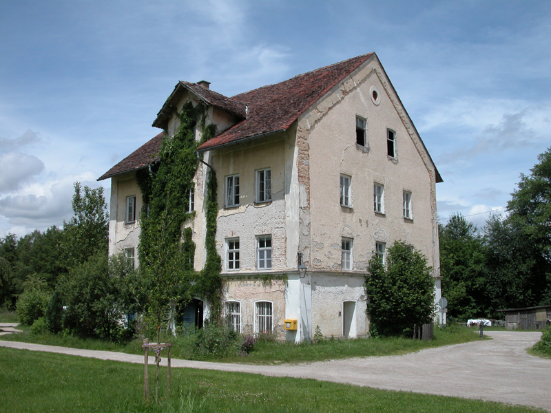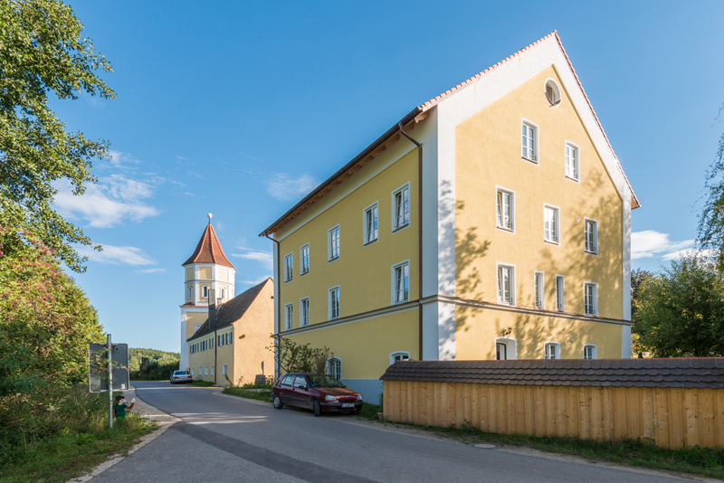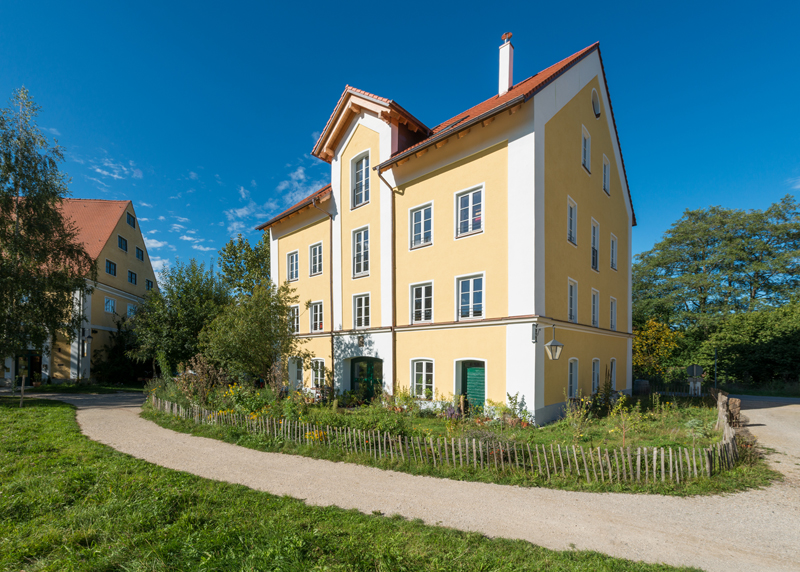 Das »Blaue Haus«, eines der Gebäude im denkmalgeschützten Rund mit wechselvoller Nutzungsgeschichte, stand bereits seit vielen Jahren leer und bot sich dafür an. Im 19. Jahrhundert als Mühle erbaut, beherbergte es vor rund 100 Jahren das erste Elektrizitätswerk in der ländlichen Gegend des Wittelsbacher Landes, war Künstlerhaus und Interimswohngelegenheit, bevor es in den letzten Jahren meist leer stand. So wurde ab Herbst 2018 das letzte noch unsanierte Gebäude in Blumenthal für die sehr beengt wohnenden Familien umgebaut und auf den neuesten Stand gebracht – KfW Energieeffizienzhaus 70 Standard. Es entstanden vier Familienwohnungen mit jeweils rund 110 m2 Wohnfläche und drei kleinere, rund 25 m2 große Appartements für Paare oder alleinstehende Mitglieder der Gemeinschaft. Im Spätsommer 2019 konnten bereits die ersten Familien ihr neues Domizil beziehen.