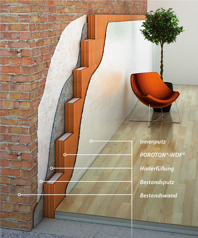 Die WDF zeichnet sich im Vergleich zu herkömmlichen Dämmsystemen laut Hersteller durch eine robuste, langlebige Konstruktion sowie niedrige Instandhaltungskosten aus. »Poroton-WDF« ist faktisch betrachtet eine massive Ziegelwand, gefüllt mit dem natürlichen Dämmstoff Perlit. Sie sei einfach und sicher in der Verarbeitung und biete einen hohen Brandschutz. Das System erfülle alle Aspekte einer baubiologisch sinnvollen und ökologischen Wärmedämmung. Es trägt laut Hersteller dazu bei, Energiekosten erheblich zu reduzieren und steigert den Wert einer Immobilie. »Poroton-WDF« ist ein diffusionsoffenes, kapillaraktives Innendämmsystem. Die porige Struktur des mineralischen Baustoffs ermögliche eine optimale Feuchtepufferung im Innenraum und schaffe auf diese Weise ein angenehmes Wohnklima.