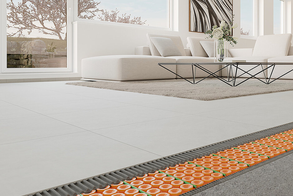 Die elektrische Boden- und Wandheizung Schlüter-Ditra-Heat-E ist mit einer Aufbauhöhe von nur 5,5 mm nahezu überall eine Lösung, um gezielt Flächen zu erwärmen. Da sich das System direkt unter dem Fliesen- oder Natursteinbelag befindet, komme die Wärme schnell und effizient an der Oberfläche an, die sich in nur 15 Minuten um ca. 4 Grad Celsius erwärmen lässt.