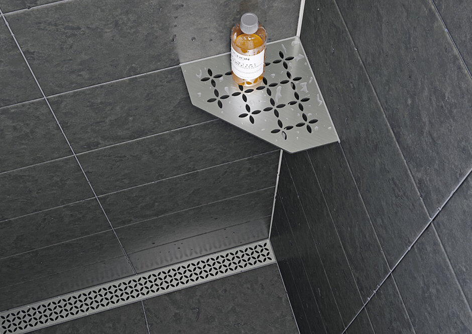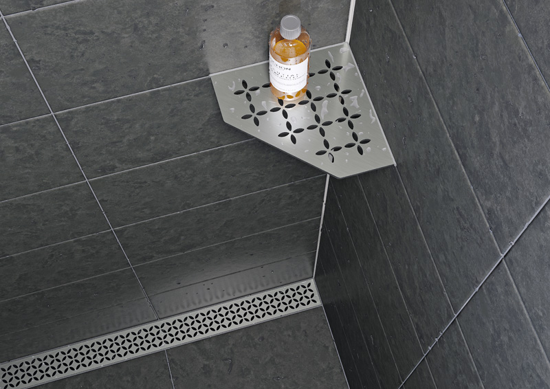 Beim Einsatz von »Schlüter-Shelf« in Badezimmern bietet sich laut Hersteller die Möglichkeit, die Ablage optisch mit der bodengleichen Dusche zu kombinieren: Die Designs »Curve« und »Floral« stammen ursprünglich aus dem Schlüter-Programm »Kerdi-Line-Style«, das elegante Abdeckungen für die Ablaufrinnen von barrierefreien Duschen umfasst. J