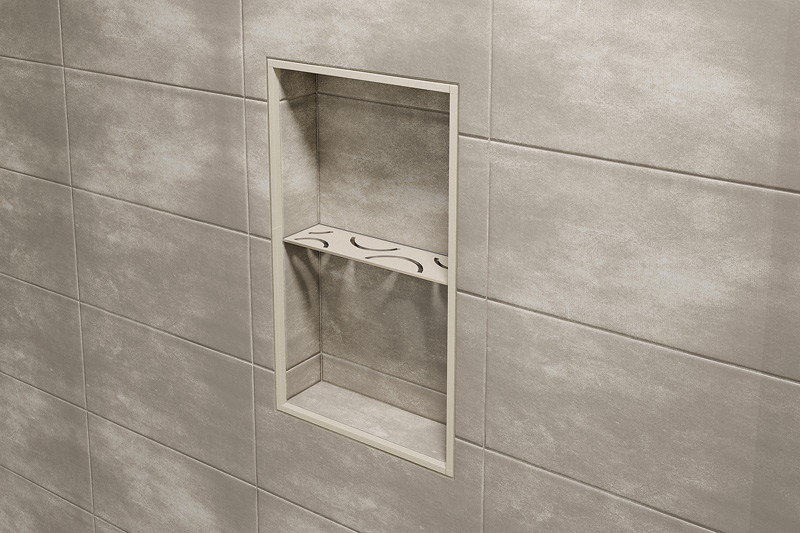 Für flächige Wandbereiche steht »Schlüter-Shelf-W« zur Verfügung. Die rechteckige Ablage wird mithilfe ihrer Befestigungsschenkel während der Fliesenverlegung in Bädern oder Fliesenspiegeln von Küchen eingebaut. Und auch für die vorgefertigten Nischenelemente Schlüter-»Kerdi-Board-N« bietet Schlüter-Systems nun eine maßgeschneiderte Ablage: »Shelf-N« wird während der Fliesenverlegung passgenau in die Nischen integriert und schafft somit einen ebenso praktischen wie eleganten zusätzlichen Regalboden.