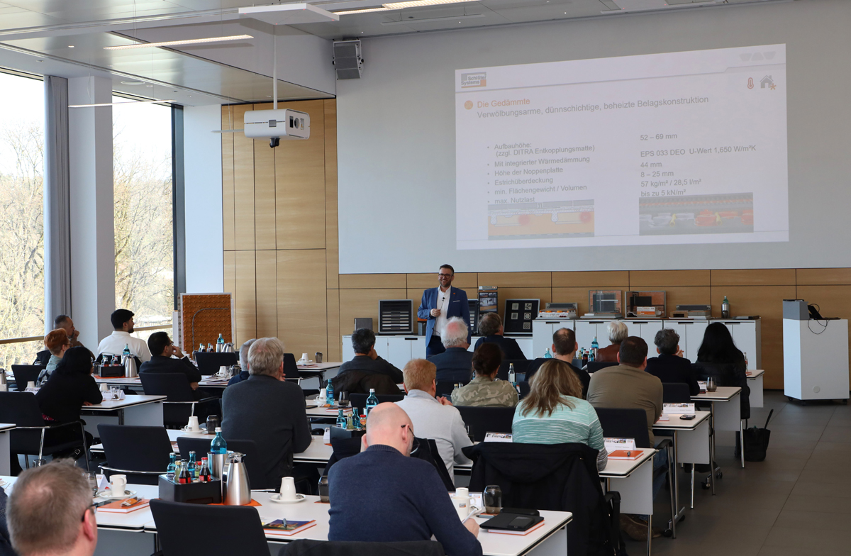 Antworten auf diese und zahlreiche weitere Fragen lieferte die zweite Auflage des gemeinsamen Architektensymposiums von Schlüter-Systems, Deutsche Rockwool und der Bienergy Gesellschaft für Energiemanagement. In drei Fachvorträgen erhielten die rund 50 Teilnehmer Hinweise zur Planung und Ausführung der Flächenheizsysteme »Schlüter-Bekotec-Therm« und »Schlüter-Ditra-Heat-E«, mit denen sowohl technische als auch normative Anforderungen vom GEG bis zur DIN 18560 erfüllt werden können. Die Neuheiten und damit verbundenen Anforderungen des GEG 2024 sowie förderfähige Maßnahmen bei Bodenflächen gemäß BEG EM waren Inhalt des zweiten Vortrags. Abschließend erfuhren die Architekten und Planer, wie langlebige Konstruktionen für Nachhaltigkeit sorgen und wie sich Gebäudehüllen energetisch sanieren lassen. Rund um die Vorträge hatten die Teilnehmenden viel Gelegenheit zum fachlichen Austausch.
