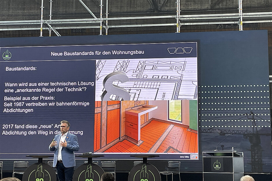»Neues Bauen braucht verlässliche Standards«, betonte Schlüter-Referent Jens Göke im Rahmen seiner Keynote. »Wir müssen beginnen, anders und vor allem einfacher zu bauen.« Anhand eines konkreten Beispiels machte er deutlich, wie lange es oft dauert, bis technisch funktionale Lösungen zu anerkannten Regeln der Technik werden: »Seit 1987 vertreiben wir bahnenförmige Abdichtungen, die den Bauprozess verkürzen und viele weitere Vorteile mit sich bringen. Aber erst 2017 fand diese Art der Abdichtung ihren Weg in die DIN 18534 zur Abdichtung von Innenräumen.«