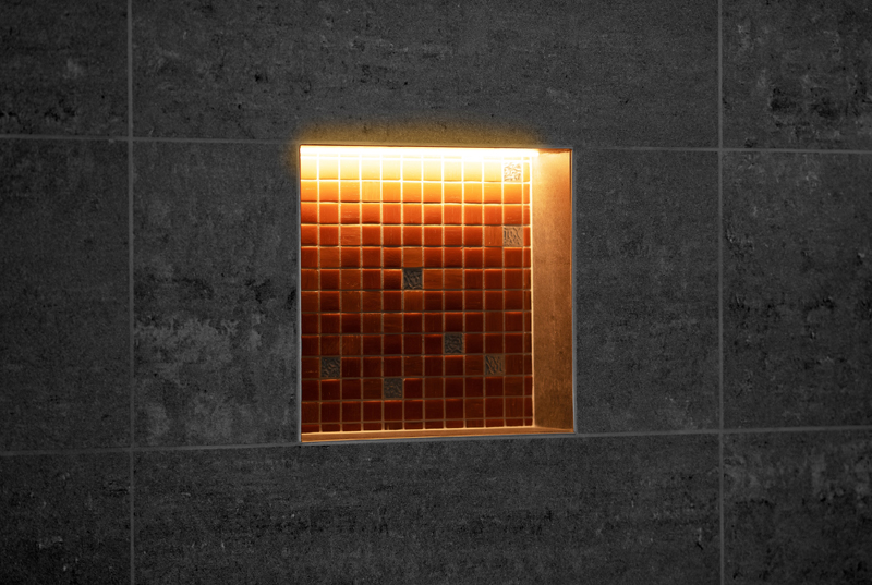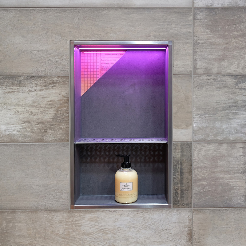 Die dazu benötigte App Schlüter-LED-COLOR-CONTROL kann kostenlos in den entsprechenden App Stores für Apple- oder Android-Geräte heruntergeladen werden. Die Nischen sind wahlweise mit Beleuchtung an der langen oder schmalen Seite erhältlich. Das RGB+W-Modul aus der Serie Schlüter-LIPROTEC-EASY kann dabei entweder an der Vorderkante, in der Mitte oder an der zu fliesenden Rückwand positioniert werden. Alle weiteren zum Einbau benötigten Teile, darunter Receiver und Netzteil sowie die Dichtmanschette, sind natürlich ebenfalls im Set enthalten. Die Nischen stehen in verschiedenen Ausführungen und Abmessungen zur Verfügung und können in Verbindung mit dem KERDI-Abdichtungssystem als Verbundabdichtung ausgeführt werden.