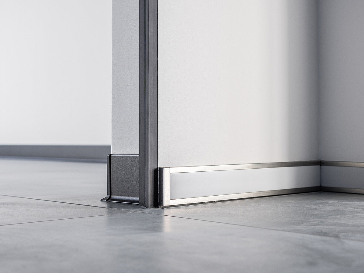 Genau dort kommt »MyDesign by Schlüter-Systems« ins Spiel: Die verwendeten Sockelleisten des Typs »Schlüter-Designbase-SL« wurden in der Farbe Graphitschwarz matt (MGS) exakt in jenem tiefmatten Schwarz pulverbeschichtet, das auch für Türzargen, Laibungen und Beschläge verwendet wurde. Dadurch entsteht ein konsequentes Farbkonzept, bei dem sich funktionale Bauteile wie die Sockelleisten harmonisch in die Architektur integrieren und zur ruhigen, kraftvollen Gesamtwirkung der Innenräume beitragen. Entscheidend dabei: Die Profiltechnik bleibt funktional unberührt – die Individualisierung erfolgt additiv, gestalterisch kontrolliert und vollständig systemkonform.