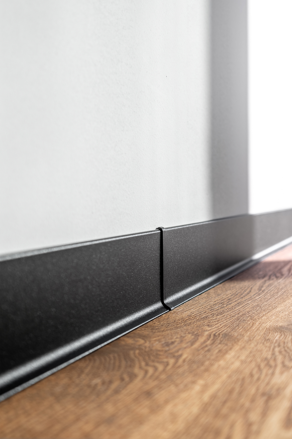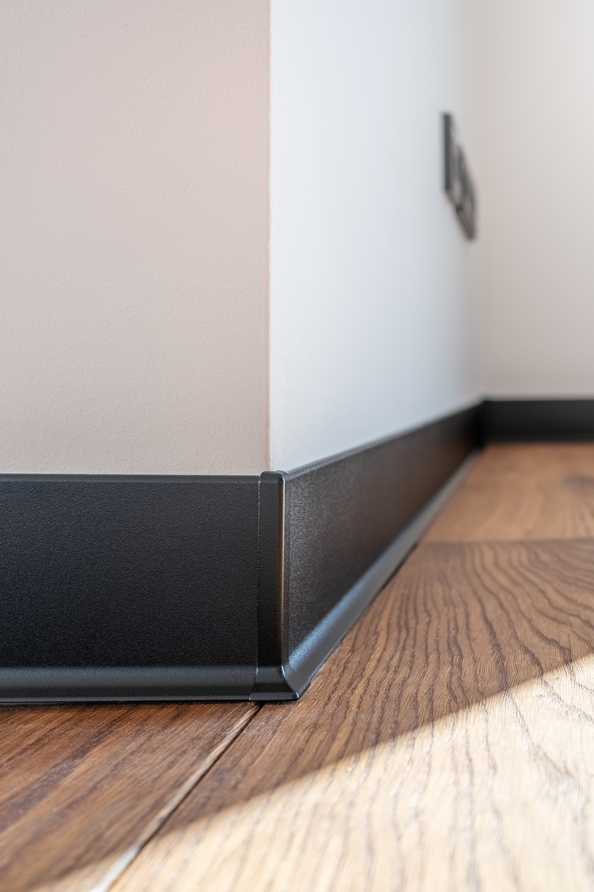 Genau hier setzt »MyDesign by Schlüter Systems« an: Die eingesetzten Sockelleisten des Typs »Schlüter Designbase SL« wurden in Graphitschwarz matt (MGS) pulverbeschichtet – exakt in dem tiefmatten Schwarz, das auch für Türzargen, Laibungen und Beschläge verwendet wurde. So entsteht ein konsequentes Farbkonzept, in dem sich funktionale Bauteile harmonisch in die Architektur integrieren und zur ruhigen, kraftvollen Gesamtwirkung der Innenräume beitragen. Entscheidend ist: Die Profiltechnik bleibt funktional unberührt – die Individualisierung erfolgt additiv, gestalterisch kontrolliert und vollständig systemkonform.