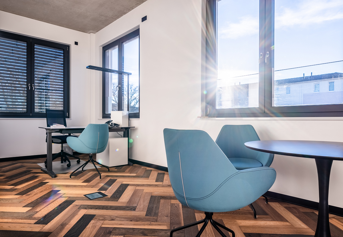 Die historische Villa Pomona, einst Teil der landwirtschaftlichen Schlossverwaltung, wurde denkmalgerecht saniert und dient heute als Sitz eines Bauunternehmens – eine gebaute Visitenkarte für moderne Planung und hochwertige Ausführung. Was auf den ersten Blick als reduzierter Innenausbau erscheint, entpuppt sich bei genauerem Hinsehen als fein orchestriertes Zusammenspiel: Materialien, Linienführung und Farbtöne sind bis zu den Sockelleisten durchgängig aufeinander abgestimmt.