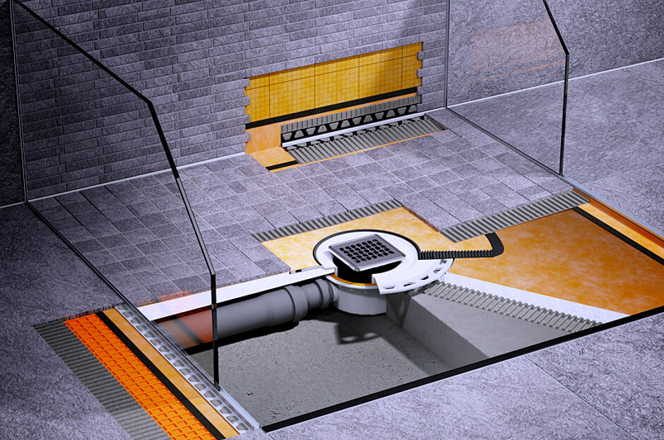 - KERDI-SHOWER-TS: Gefälleboard für dezentrale Punktentwässerung, z. B. im Austausch für eine Badewanne.