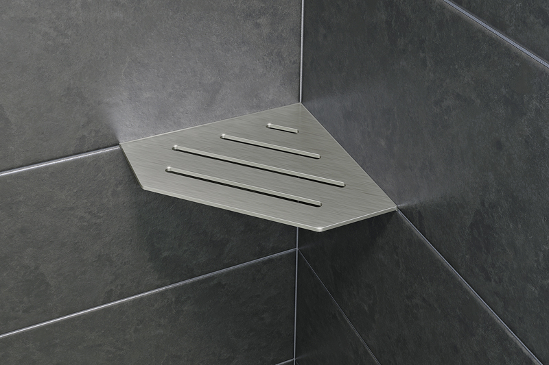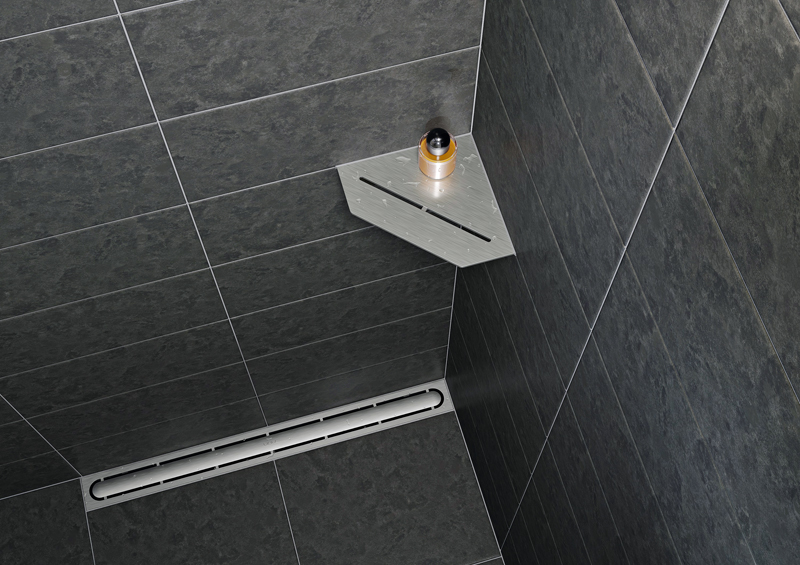 »Schlüter-Shelf« steht in fünf verschiedenen Formen zur Verfügung: drei Ecklösungen, ein freihängendes Wandregal sowie eine Ablage für den Einbau in Wandnischen. Die Ablagen werden bei der Fliesenverlegung in die Fugen der Wand integriert – die Ecklösungen können auch nachträglich ohne Bohren angebracht werden. J