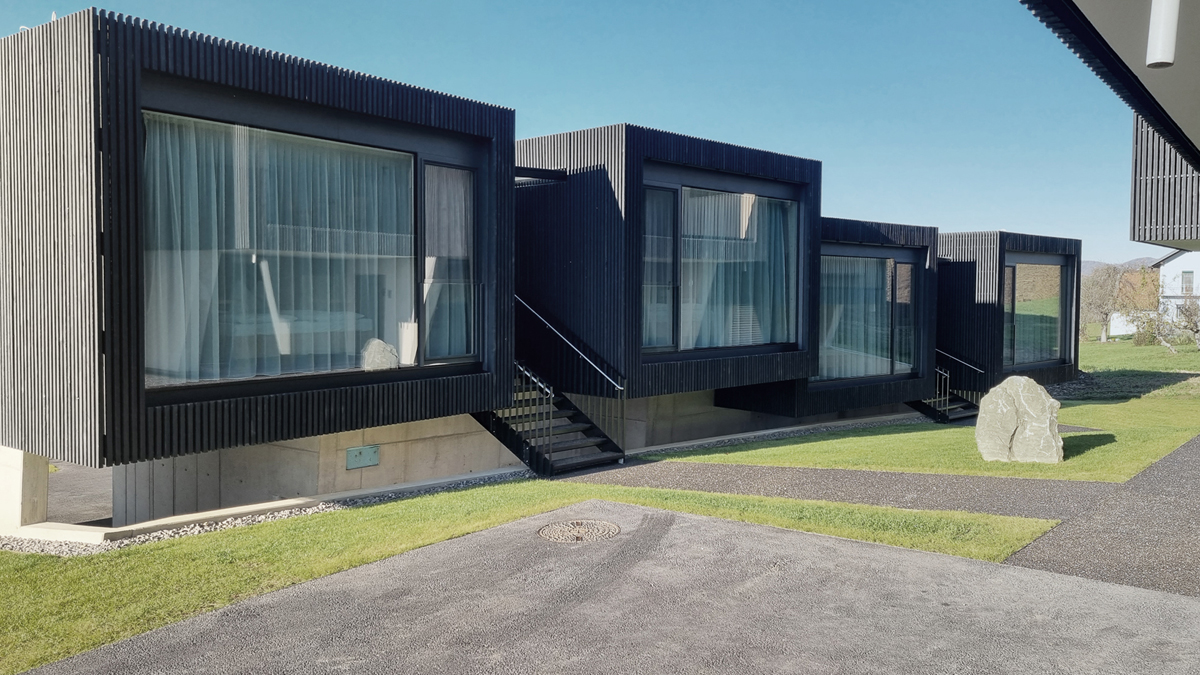Stock & Stein Lodges heißen die zwölf einzelnstehenden Holz-Kuben, die Feriengästen in der Nähe von Bad Gleichenberg in der Steiermark ein komfortables Dach über dem Kopf bieten. Sie stehen auf vulkanischem Boden, mit reichlich Basaltvorkommen und in unmittelbarer Nähe eines Waldes. Daraus setzt sich auch der Name der Anlage zusammen: Stock steht für das Holz, das für die Wohnkuben verwendet wird, Stein – hier in Form von Beton – für die Gebäudebasis, auf der die Wohnkuben ruhen. Die Schnittstelle der Materialen Holz und Beton bildeten nicht nur den konstruktiv-thermischen Knackpunkt dieses Projekts, sondern die Kombination erfüllte auch den Anspruch des Grazer Architekten Thomas Zach, die Wandscheiben des Sockelgeschosses in Sichtbeton zu belassen.