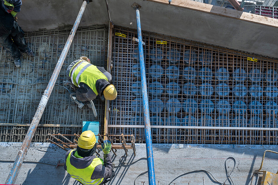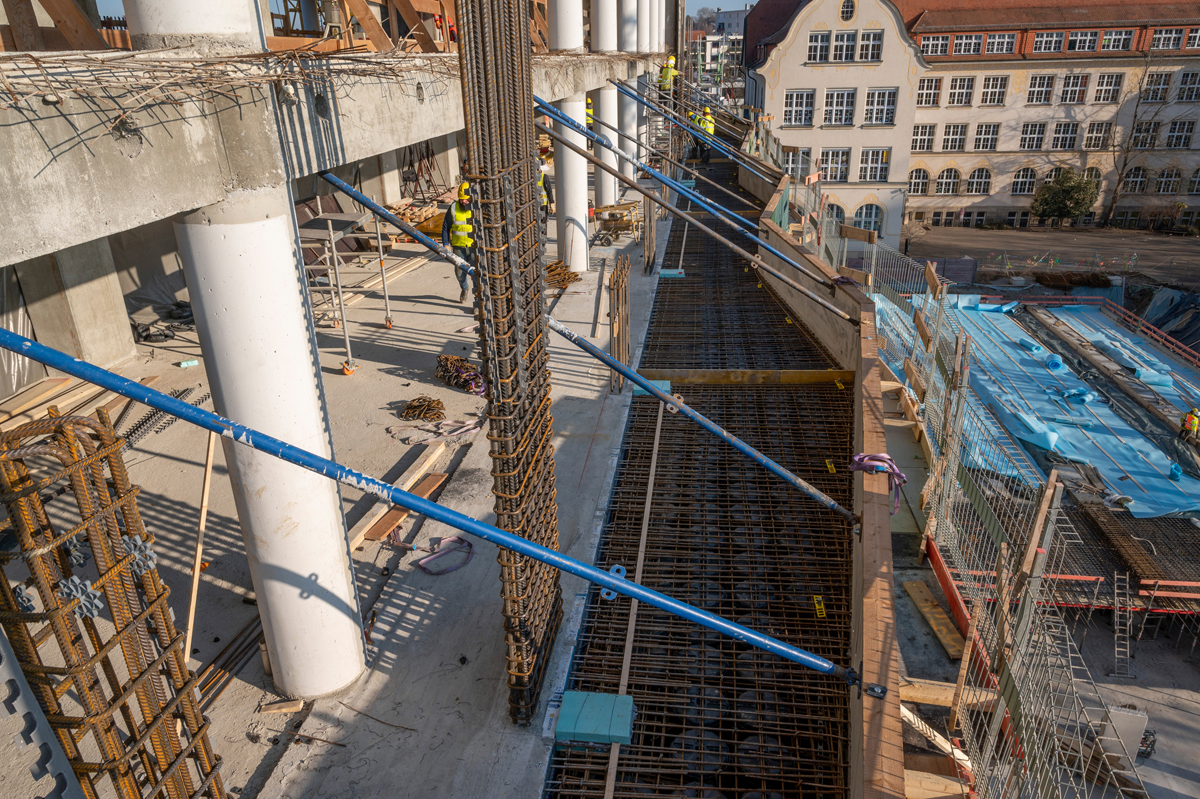 Für die Erweiterung wurde eine, dem vorhandenen Stützenraster folgende, neue Fassadenwand im Ortbetonverfahren erstellt und an das Bestandsgebäude angebunden. Diese besteht aus den vertikal verlaufenden Wandscheiben, sprich Fassadenstützen und den horizontal verlaufenden Geschossdecken. Die Hauptlast der Geschossdecken wird über die neuen Fassadenstützen abgetragen. Um die Statik zu gewährleisten, gründen die vertikalen Wandscheiben auf Mikropfählen. In die neu angesetzten Deckenstreifen wurde »Schöck Isokorb T Typ K« als tragendes Wärmedämmelement zum Anschluss der frei auskragenden Stahlbetonbalkone einbetoniert.