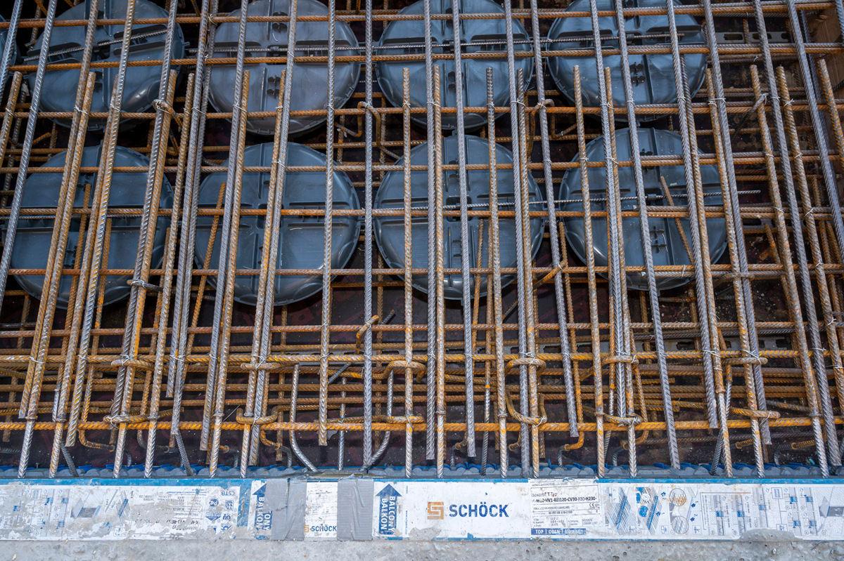 Die neue Geschossdecke – der Erweiterungsstreifen, der an die bestehende Geschossdecke angebunden wurde – lagert auf der neuen vorgesetzten Fassadenkonstruktion. Die Last der bis zu 12,90 m langen und 1,13 bis 2,43 m tiefen Balkonplatten von »Ode Lofts« wird geschossweise voll über »Schöck Isokorb« auf diese vorgesetzte Fassadenkonstruktion abgetragen. Seitliche Lagerpunkte existieren nicht. »Wir wollten den Anschluss mit ›Schöck Isokorb‹ lösen, denn wir haben bereits in anderen Projekten gute Erfahrungen mit diesem bewährten Produkt gemacht, auch was die Planungsunterlagen und die Unterstützung des Herstellers bei Sonderlösungen angeht«, erklärt Tobias Tiyaworabun, Projektingenieur vom Ingenieurbüro Werner Sobek Frankfurt, die Wahl. Die vor dem Betonieren in die Balkonplatten eingelegten Hohlkörper führten darüber hinaus zu einer Lastminderung von circa 15 Prozent. Laut Tragwerksplaner war die Minimierung des Eigengewichts in Anbetracht des spezifischen Konstanzer Baugrunds und der sensiblen Gründung aus Mikropfählen eine entscheidende Überlegung zur Realisierung der neuen vorgesetzten Konstruktion.