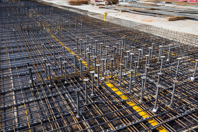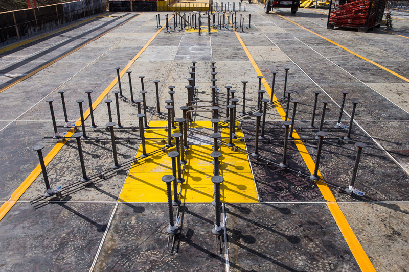 Ein Projekt dieser Größenordnung mit seinen vielfältigen, unterschiedlichen Nutzungen und entsprechenden baulichen Anforderungen erfordert ein umfangreiches bautechnisches Know-how, auf das Felbermayr mit seiner langjährigen Erfahrung aus zahlreichen Spezialbauvorhaben zurückgreifen kann. So wurde bereits im Rohbau auf den Einsatz hochwertiger Produkte größten Wert gelegt und auf die bewährte Technik aus dem Hause Schöck gesetzt, wie zum Beispiel im Bereich der Betondecken, wo punktförmig mit Säulen gestützte Flachdecken maximale Flexibilität in der Grundrissgestaltung sowie die volle Nutzbarkeit der Geschossfläche sicherstellen. Das für diese Konstruktion kritische Problem des Durchstanzens der Säulen, verbunden mit Rissbildung in der Decke und im Extremfall Einbüßen der Tragfähigkeit, wurde mit der Schöck Bole Typ U als Durchstanzbewehrung verhindert. Diese besteht aus Doppelkopfbolzen beziehungsweise -ankern, die über Distanzstäbe in der richtigen Position gehalten werden. Diese Bewehrungselemente werden mit Abstandhaltern auf die Schalung beziehungsweise dem Grund der Bodenplatte aufgestellt und anschließend die Bewehrung verlegt. Damit ist nicht nur der Einbau selbst deutlich vereinfacht, sondern es verkürzt auch die Installationszeit signifikant, was sich vor allem bei Projekten mit knapp bemessener Bauzeit als wesentlicher Vorteil erweist.