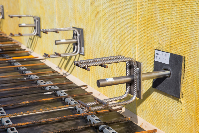 Über 10.000 Quadratmeter beträgt die Fläche der Tiefgarage, auf der alle anderen Gebäude lasten. Bau- und ausführungstechnisch stellte das Untergeschoss damit einen der anspruchsvollsten Bauabschnitte dar und erforderte entsprechendes Know-how und Ausführungsqualität. Aufgrund der Dimension wurde das Tiefgeschoss zur Unterbrechung und Vermeidung von Spannungsrissen in drei Bauabschnitten in Ortbetonbauweise errichtet. In der Regel ist die Herstellung der Dehnungs- beziehungsweise Dilatationsfugen zwischen den einzelnen Abschnitten mit einem erheblichen baulichen und zeitlichen Aufwand verbunden. Durch den Einsatz von Schöck Querkraftdornen entfallen komplizierte Detaillösungen wie Stützkonsolen oder Gleitlager zur Gänze. Die einbaufertigen Dorne aus Edelstahl übernehmen die Übertragung der Querkräfte und sorgen durch ihre Beweglichkeit für riss- und zwängungsfreie Bauteilanschlüsse – und sind, einmal eingebaut, zudem vollständig wartungsfrei.