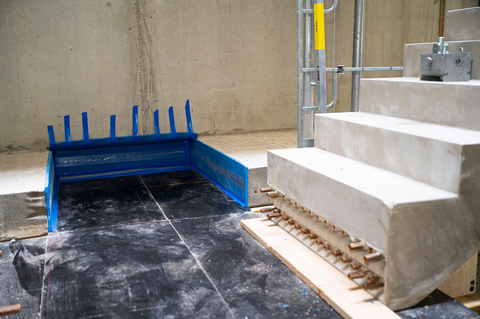 Die »Tronsole« wird vor der Montage der Treppen direkt auf der Baustelle eingebaut. Die halbgewendelten Treppenläufe des Projekts »immergrün« wurden als Fertigteile hergestellt. Üblicherweise wird der Fertigteiltreppenlauf an den Flanken, die die Treppenhauswände tangieren, umlaufend mit der Fugenplatte »Tronsole Typ L« beklebt. Da es sich bei diesem Objekt allerdings um eine frei im Raum hängende Treppe handelt, erfolgte der Einbau der »Tronsole« Typen hier ausschließlich am Antritt des Treppenlaufs im Erdgeschoss und an den Auflagerpunkten der Stege. Hans-Dieter Böß, Bauleiter bei der mit dem Einbau beauftragten Porr GmbH & Co. KGaA, erklärt: »Vor dem Einbau der ›Tronsole‹ reinigen wir den Treppenlauf von Staub und Schmutz. Danach ziehen wir die Schutzfolie ab, richten die ›Tronsole‹ am Fuß des gewendelten Treppenlaufs aus und kleben sie mit den integrierten Selbstklebebändern auf den Treppenfuß auf. Den überstehenden Schaum schneiden wir dann einfach mit einem Cuttermesser ab.«