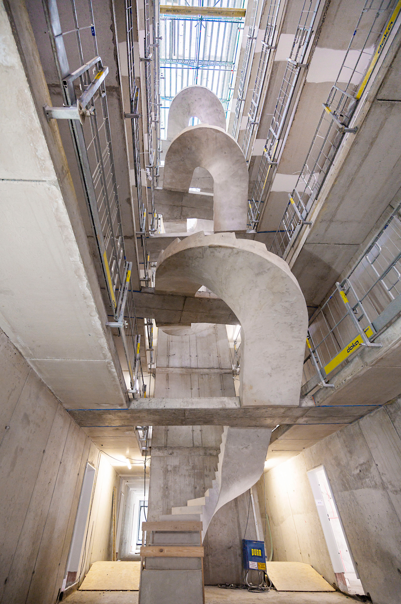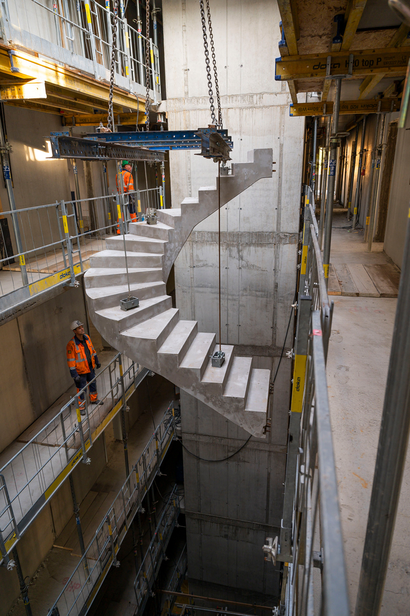 Die Einleitung der Lasten und die Schallentkopplung der Treppenskulptur findet in den speziell dafür vorgesehenen Auflagerbereichen statt. Die Konstruktion erschließt die Galerien des Atriums über sechs Geschosse hinweg. Aufgrund dieser Höhe und des dafür notwendigen zusammenhängenden Tragwerks wurden die Stege in Ortbeton gefertigt. Die halbgewendelten Treppenläufe hingegen wurden als Stahlbetonfertigteile vom Fertigteilwerk Gilne geliefert und mithilfe einer speziellen eingeschraubten Anschlussbewehrung mit der Armierung der Stege verbunden.