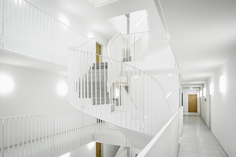 Neben der repräsentativen Treppe im Atrium verfügen die Häuser über einen Aufzug und ein Fluchttreppenhaus mit halbgewendelten Fertigteiltreppenläufen. Die Treppenläufe werden zu den Decken hin mit der »Schöck Tronsole Typ F«, zu den Treppenhauswänden hin mit der »Tronsole Typ Q« aufgelagert. Die Treppe ist dadurch akustisch vom Gebäude entkoppelt. Damit die »Tronsole Typ F« beim Versetzen der Treppen nicht verrutscht, lässt sie sich durch die integrierten Montagekleber passgenau am Fertigteil aufkleben.